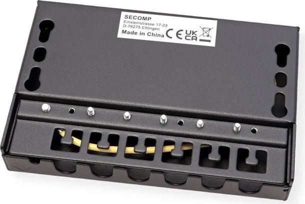 Kleines geschirmtes 6-fach Verteilerfeld für RJ45-Netzwerkkabel, optional zur Montage an die Wand • Das System besteht aus dem Mini-Patchpanel mit Erdungsanschluss • Anschluss der Kabel über LSA-Anschlusstechnik; aufgedruckte Farbcodierung gemäß EIA / TIA 568A und 568B • Ports mit Staubschutzklappen • Kann an die Wand montiert werden • Farbe: schwarz.