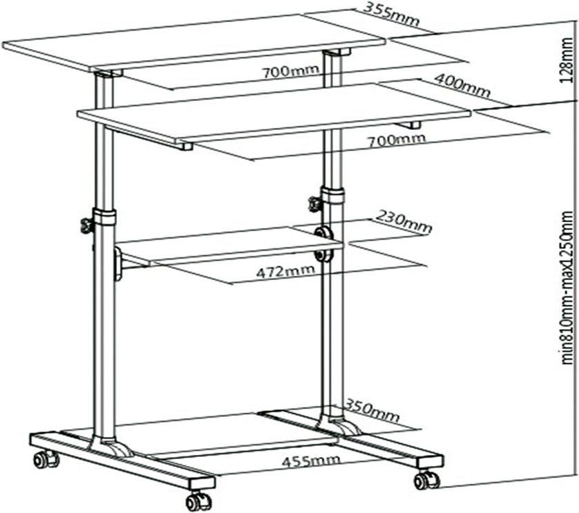 | Abmessung | Printer shelf - Breite: 47.2 cm, Tiefe: 23 cm Unteres Fach - Breite: 45.5 cm, Tiefe: 35 cm Tastaturablage - Breite: 70 cm, Tiefe: 40 cm Oberstes Regal - Breite: 70 cm, Tiefe: 35.5 cm |