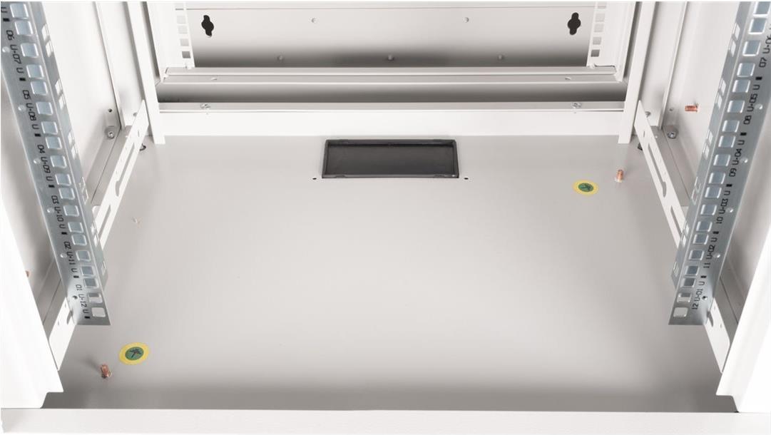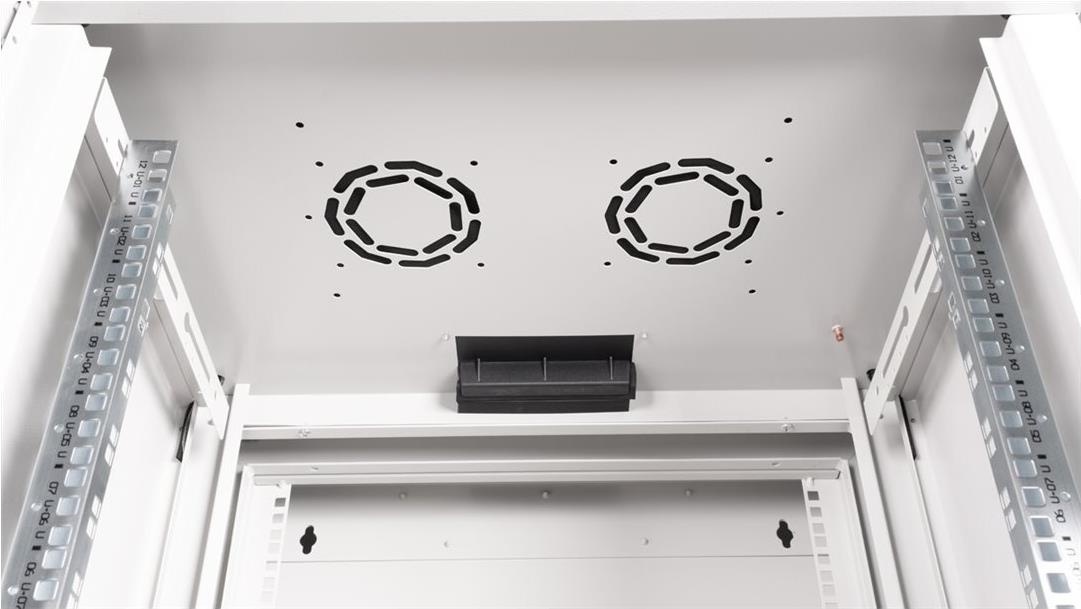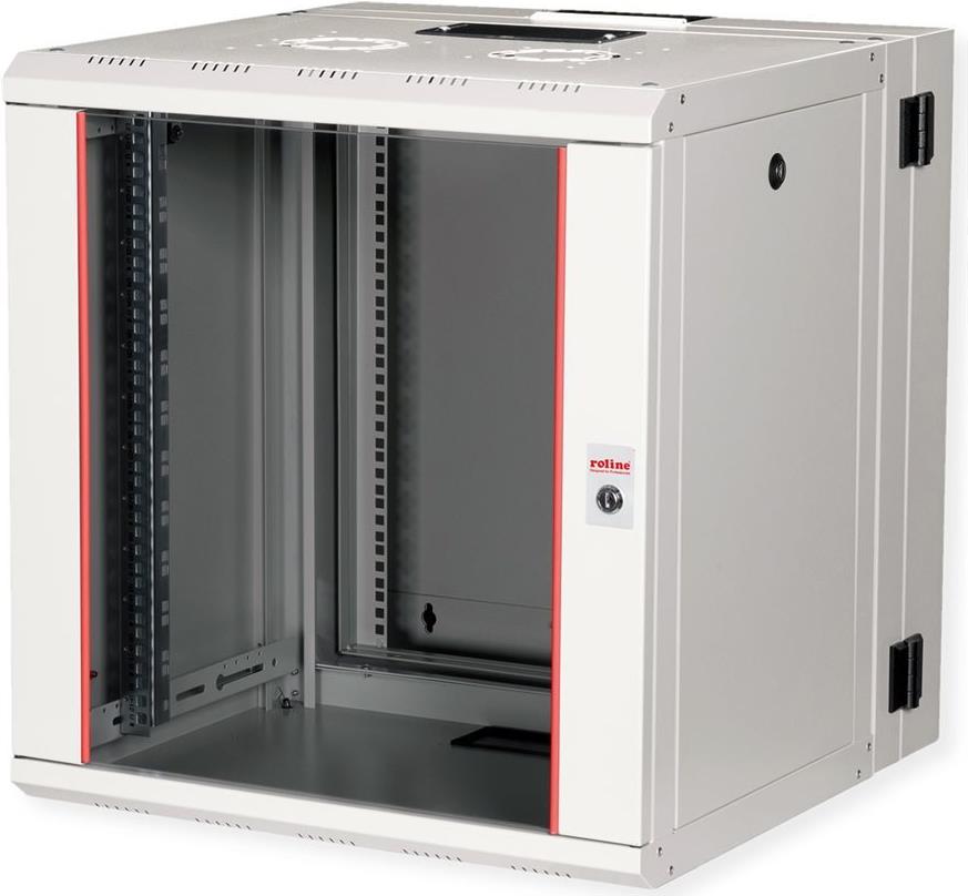 ROLINE 19 Zoll Wandgehäuse Pro 12 HE 600x600 BxT zweiteilig schwenkbar grau Die Wandgehäuse der ROLINE Pro Serie wurden speziell für eine flexible Netzwerkverkabelung konzipiert. Durch das integrierte Scharnier im rückseitigen Rahmen lässt sich das Gehäuse bei Bedarf zur Seite klappen. Jeder Schrank verfügt im Dach über einen verschiebbaren Kabeleinlass mit Moosgummidichtung. Rückwand und Boden sind mit ausgestanzten Kabeleinlässen und Kunststoffabdeckungen versehen. Der rückseitige Rahmen ist oben und unten mit Bürstenleisten ausgestattet. Zur Installation eines Lüftermoduls ist das Dachchassis bereits mit einem passenden Ausschnitt versehen. Im Inneren befinden sich galvanisierte 19"-Profilschienen, die in beide Richtungen ablesbar und in der Tiefe verstellbar sind. Der rückseitige Rahmen hat zusätzlich eine 19"-Lochung. Jeder Schrank besteht aus einer robusten Stahlkonstruktion aus bis zu 1,5 mm starkem Stahlblech und ist in den Standardfarben Grau (RAL 7035) und Schwarz (RAL 9005) elektrostatisch pulverbeschichtet. Modular abschließbare und abnehmbare Seitenwände sowie eine abschließbare und abnehmbare Fronttür verbessern die Zugänglichkeit. Der Türanschlag kann gewechselt werden. Die Wandmontage erfolgt in zwei einfachen Schritten: Der Rahmen des Gehäuses wird in der gewünschten Öffnungsrichtung an die Wand montiert und anschließend mit dem Gehäuse verbunden. Optional können die Wandgehäuse der ROLINE Pro Serie mit Nivellierfüßen oder Rollen auch freistehend genutzt werden. • Fronttür aus gehärtetem Glas, abschließbar • 1-Punkt-Verriegelung an der Fronttür • Gehäuse ist mit rückseitigem Rahmen durch separates Schloss verbunden • Kabelzuführung an Rückseite und Boden • Seitenteile sind abschließ- und abnehmbar • Dach mit Austanzung für Lüftermodule • Lüftungsschlitze für passive Be- und Entlüftung • Inkl. Befestigungsmaterial • IP Schutzklasse: IP20.