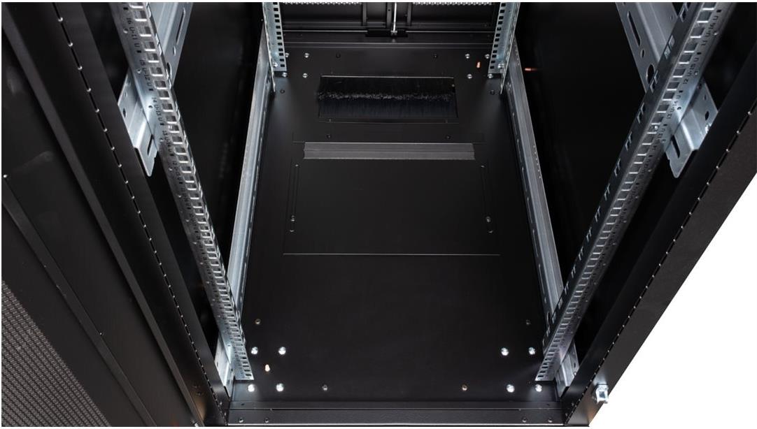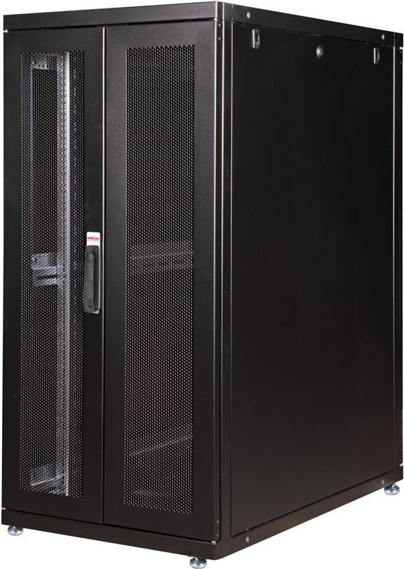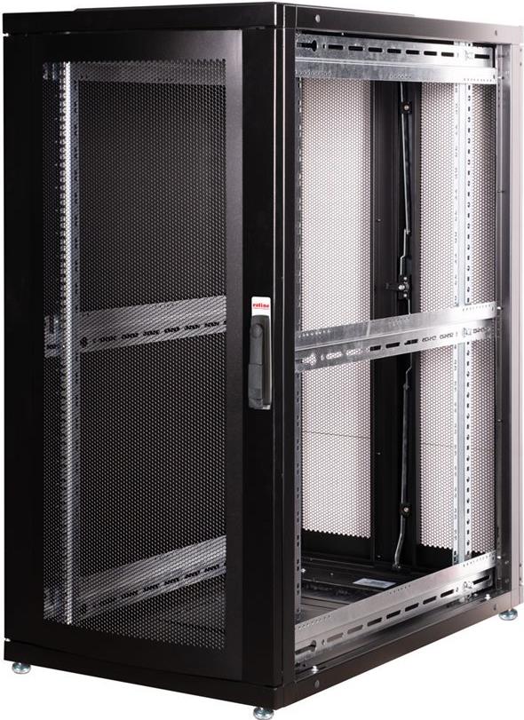 ROLINE 19 Zoll Serverschrank Pro 26 HE 600x1000 BxT schwarz Die Serverschränke der ROLINE Pro Serie wurden speziell für eine komfortable und flexible Netzwerkverkabelung entwickelt. Seitlich im Dach und Boden (ab 800 mm Schrankbreite) befinden sich Einlässe mit Bürsten, ein aufschiebbarer Einlass mit Moosgummidichtung sowie ein zusätzlicher Bürsteneinlass im Bodenchassis, die vielseitige Einsatzmöglichkeiten bieten. Perforierte Einflügel-Fronttüren und doppelflügelige Rücktüren, jeweils mit Schwenkgriff und Profil-Halbzylinder, sorgen für eine verbesserte Luftzirkulation. Das Dach verfügt über eine perforierte Abdeckung, die eine einfache Installation eines Lüftermoduls ermöglicht. Im Inneren des Schranks sind zwei Paar galvanisierte 19"-Profilschienen montiert, die mit in beide Richtungen ablesbaren Höheneinheiten ausgestattet und in der Tiefe verstellbar sind. Zusätzlich sind sie mit Tiefenstreben verbunden. Jeder Schrank besteht aus einer robusten Stahlkonstruktion mit einer Materialstärke von bis zu 2,0 mm. Die Schränke sind elektrostatisch pulverbeschichtet und in den Standardfarben Grau (RAL 7035) und Schwarz (RAL 9005) erhältlich. Modular abschließ- und abnehmbare Seitenwände (ab 42HE horizontal geteilt) und Türen verbessern die Zugänglichkeit. Der Türanschlag kann ebenfalls gewechselt werden. Die komplette Konstruktion ist zerlegbar, weshalb die Schränke bei Bedarf vollständige demontierbar wären.