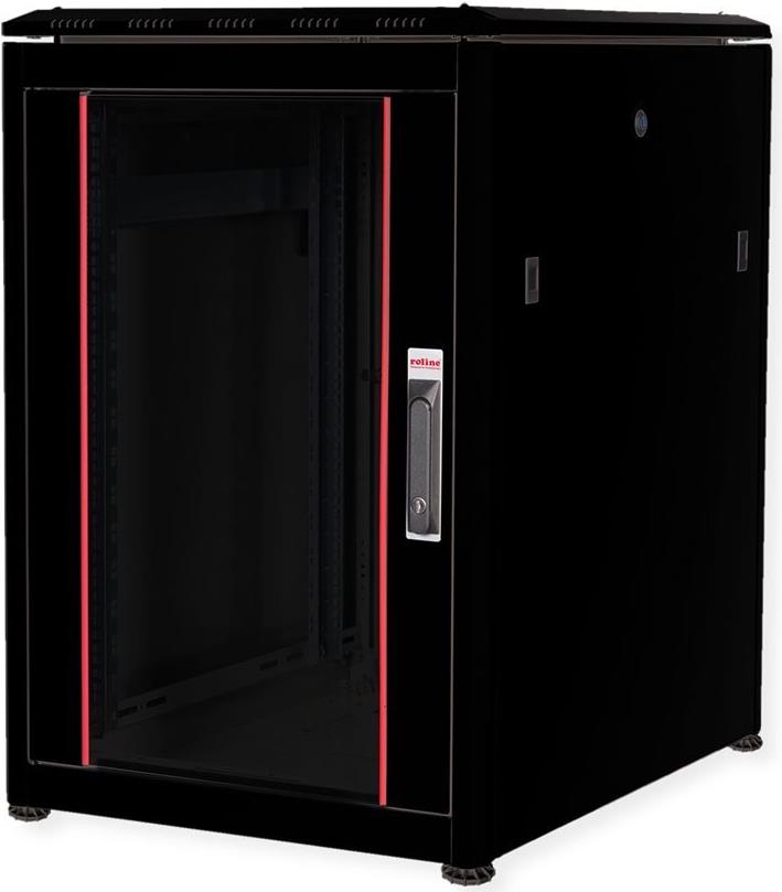 ROLINE 19 Zoll Netzwerkschrank Pro 16 HE 600x800 BxT Glastür schwarz Die Netzwerkschränke der ROLINE Pro Serie wurden entwickelt, um eine besonders komfortable und flexible Netzwerkverkabelung zu ermöglichen. Mit Bürsteneinlässen im Dach- und Bodenbereich (ab 26HE und 800 mm Schrankbreite), einem aufschiebbaren Einlass im Bodenchassis mit Moosgummidichtung sowie Bürstenleisten ober- und unterhalb der Rücktür (ab 26HE) bieten sie vielseitige Einsatzmöglichkeiten für verschiedene Anwendungsszenarien. Vertikale Kabelführungskanäle mit Blende, installiert neben den Profilschienen (ab 800 mm Schrankbreite), vervollständigen das Design. Ein abgesetzter, abnehmbarer Deckel mit Lüftungsschlitzen verbessert die Luftzirkulation und ermöglicht eine einfache Installation eines Lüftermoduls. Die Lüftereinheit kann von oben ein- und ausgebaut werden, ohne dass die Komponenten im Inneren betroffen sind. Im Inneren sind zwei Paar galvanisierte 19"-Profilschienen verbaut, die in beide Richtungen ablesbar und in der Tiefe verstellbar sind. Sie sind zudem mit zusätzlichen Tiefenstreben im Schrank verbunden. Jeder Schrank besteht aus einer robusten Stahlkonstruktion mit einer Materialstärke von bis zu 1,5 mm Stahlblech. Die Farbgebung erfolgt mittels elektrostatischer Pulverbeschichtung in den Standardfarben Grau (RAL 7035) und Schwarz (RAL 9005). Modular abnehmbare Seitenwände und Türen verbessern die Zugänglichkeit. Ein Wechsel des Türanschlags ist möglich. Die Schränke sind bei Bedarf auch vollständig zerlegbar.