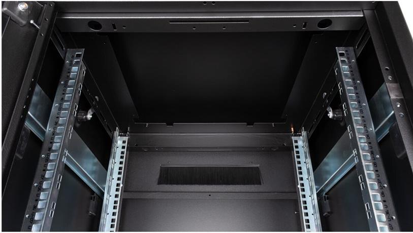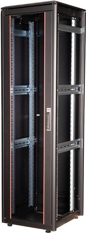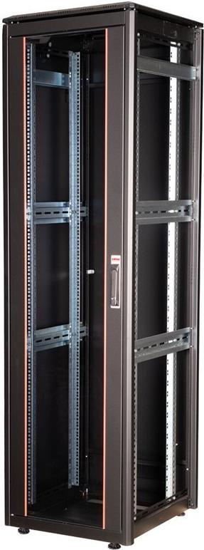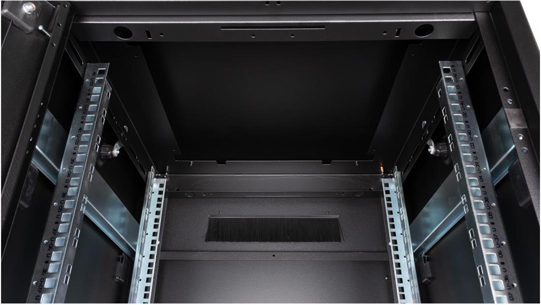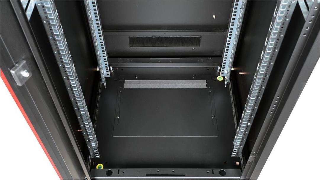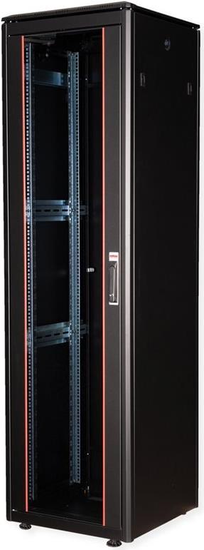 ROLINE 19 Zoll Netzwerkschrank Pro 42 HE 600x600 BxT Glastür schwarz Die Netzwerkschränke der ROLINE Pro Serie wurden entwickelt, um eine besonders komfortable und flexible Netzwerkverkabelung zu ermöglichen. Mit Bürsteneinlässen im Dach- und Bodenbereich (ab 26HE und 800 mm Schrankbreite), einem aufschiebbaren Einlass im Bodenchassis mit Moosgummidichtung sowie Bürstenleisten ober- und unterhalb der Rücktür (ab 26HE) bieten sie vielseitige Einsatzmöglichkeiten für verschiedene Anwendungsszenarien. Vertikale Kabelführungskanäle mit Blende, installiert neben den Profilschienen (ab 800 mm Schrankbreite), vervollständigen das Design. Ein abgesetzter, abnehmbarer Deckel mit Lüftungsschlitzen verbessert die Luftzirkulation und ermöglicht eine einfache Installation eines Lüftermoduls. Die Lüftereinheit kann von oben ein- und ausgebaut werden, ohne dass die Komponenten im Inneren betroffen sind. Im Inneren sind zwei Paar galvanisierte 19"-Profilschienen verbaut, die in beide Richtungen ablesbar und in der Tiefe verstellbar sind. Sie sind zudem mit zusätzlichen Tiefenstreben im Schrank verbunden. Jeder Schrank besteht aus einer robusten Stahlkonstruktion mit einer Materialstärke von bis zu 1,5 mm Stahlblech. Die Farbgebung erfolgt mittels elektrostatischer Pulverbeschichtung in den Standardfarben Grau (RAL 7035) und Schwarz (RAL 9005). Modular abnehmbare Seitenwände und Türen verbessern die Zugänglichkeit. Ein Wechsel des Türanschlags ist möglich. Die Schränke sind bei Bedarf auch vollständig zerlegbar.