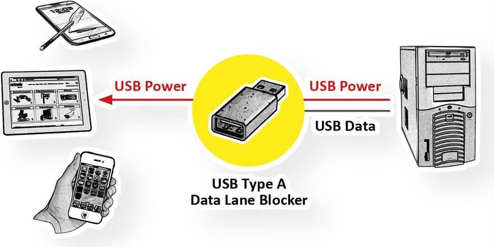 Der USB Typ A Datenblockier-Adapter stoppt die Datenleitungen des verwendeten USB-Anschlusses aus und beschützt so Ihr Endgerät vor ungewolltem Zugriff oder Schadsoftware - es wird nichts außer Strom übertragen. Die Lösung ist vor allem sinnvoll in fremden Umgebungen, in denen vergleichsweise leicht USB-Buchsen manipuliert oder gekapert werden können, wie beispielsweise in Hotels, oder Ankerpunkten wie Flughäfen oder Bahnhöfen.