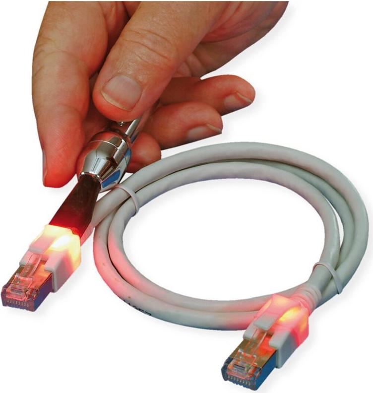 • Nach der Kontaktierung einer beliebigen Patchkabelseite mit dem Injektor leuchten die integrierten Leuchtdioden in den RJ45-Steckern.