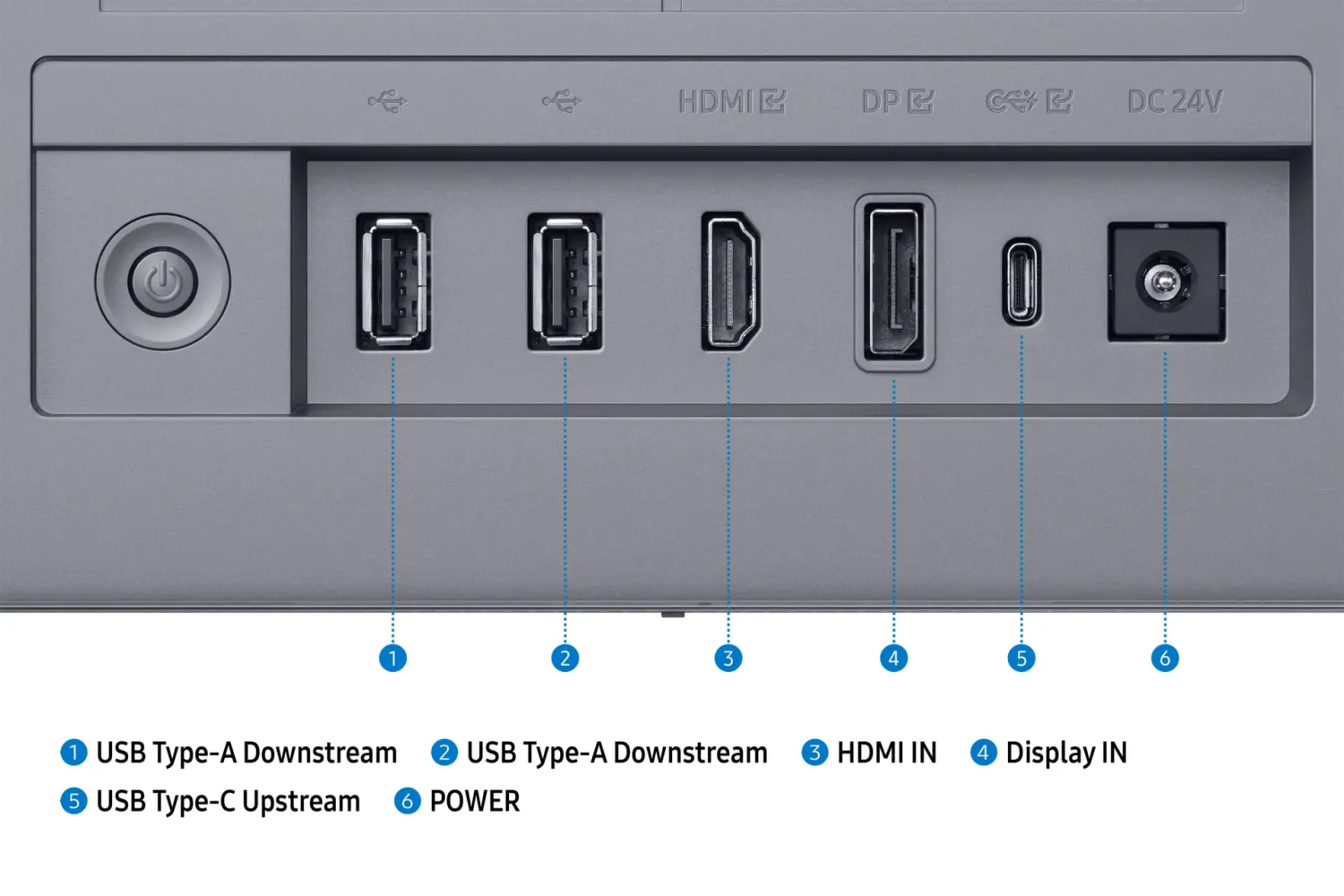 1x DisplayPort 1.4 (HDCP 2.2), 1x HDMI 2.1 (CEC, HDCP 2.2), 1x USB-C 2.0 mit DisplayPort 1.4 (Upstream, 480Mb/?s, PD-Out 90W), 2x USB-A 2.0 (Downstream, 480Mb/?s), 1x DC-In Hohlbuchse (Netzanschluss) |