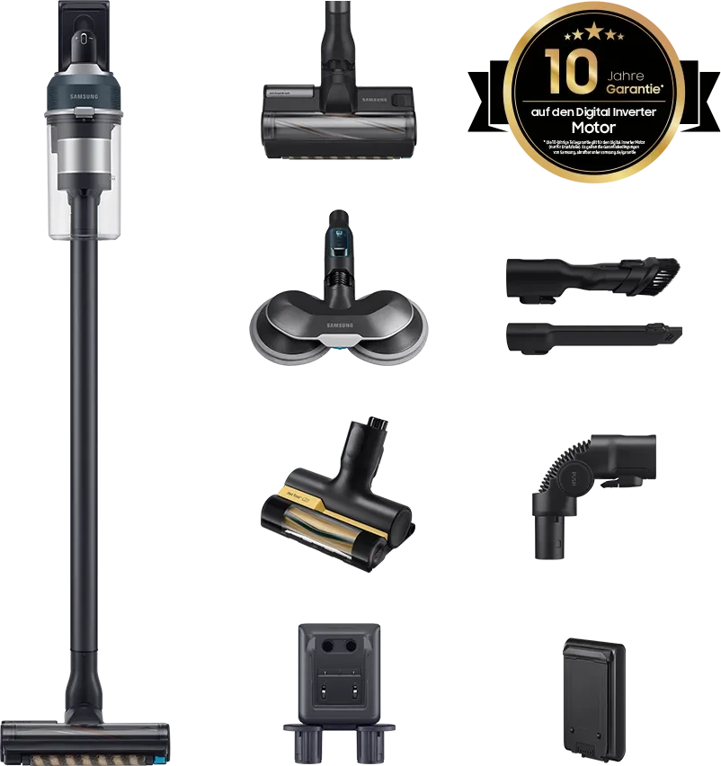 | Lieferumfang | Staubsauger, Jet Dual Bürste, Spray Spinning Sweeper Wischaufsatz, Pet Tool+, Ausziehbare Teleskop-Fugendüse, 2-in-1 Kombidüse, Flex Tool, Ladestation, Akku |