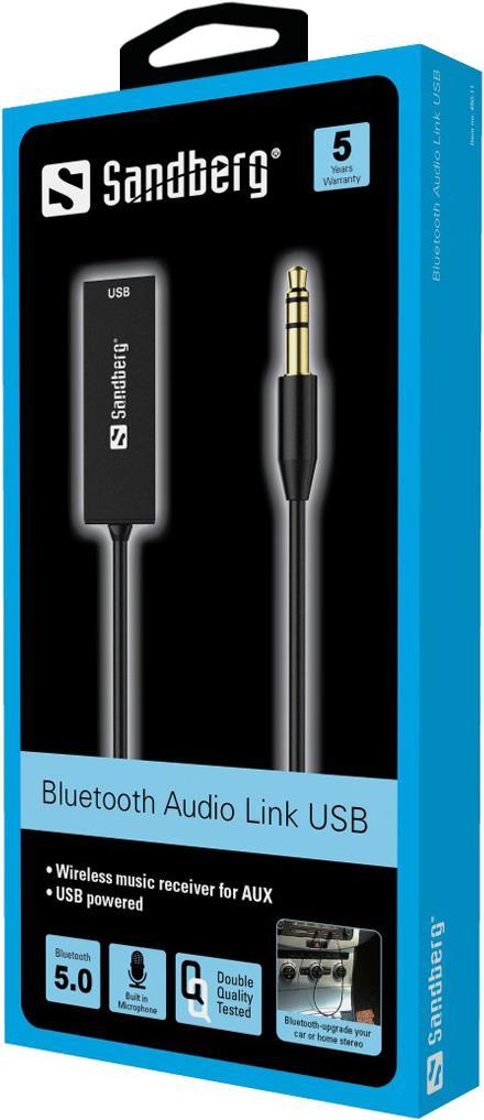 Mit dem Sandberg Bluetooth Audio Link können Sie Ihr Mobiltelefon, Ihren PC, Ihre Playstation 3 oder andere Audiogeräte mit eingebautem Bluetooth drahtlos an einen Verstärker anschließen. Der Sandberg Bluetooth Audio Link lässt sich leicht an den AUX-Eingang des Verstärkers anschließen und empfängt das Musiksignal dann drahtlos über Bluetooth. Der eingebaute Akku kann über USB aufgeladen werden und garantiert 12 Stunden Betriebszeit und mehr als 200 Stunden Standby. Kann auch mit permanenter Stromversorgung über ein USB-Ladegerät/einen PC verwendet werden. Deutsche Anleitung.