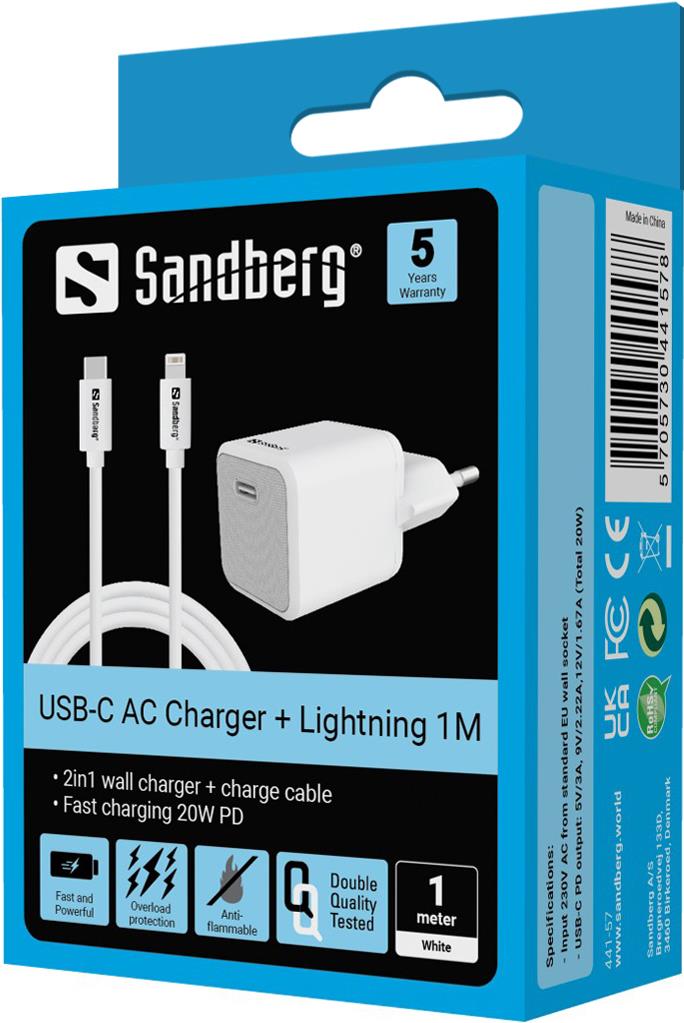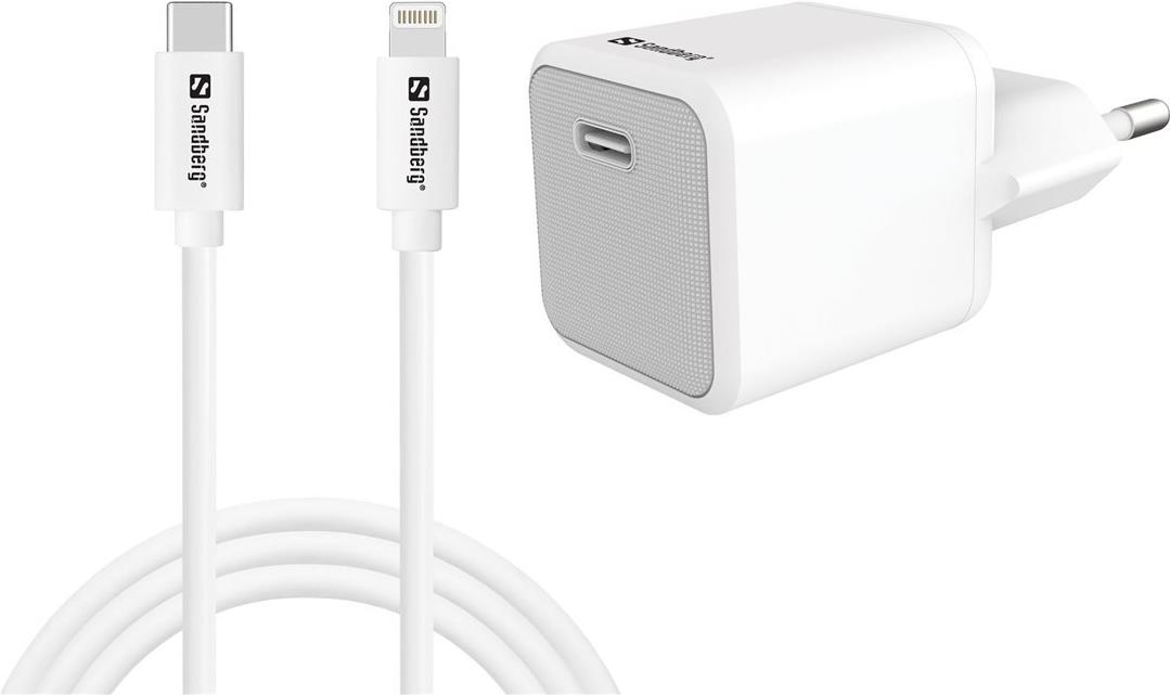 Sandberg - Netzteil - 2-in-1 - 20 Watt - 3 A - PD (24 pin USB-C) - auf Kabel: Lightning - weiß - Europa - mit USB-C to Lightning cable (1m) (441-57)