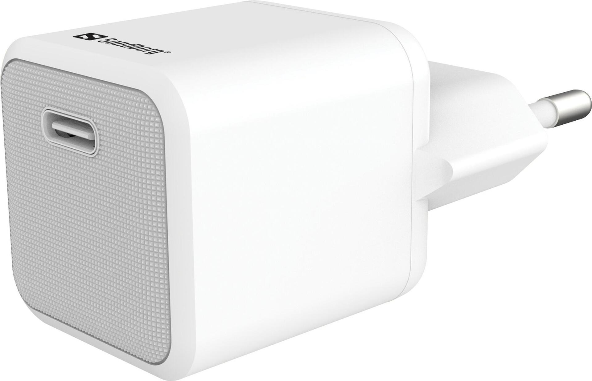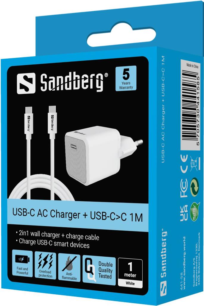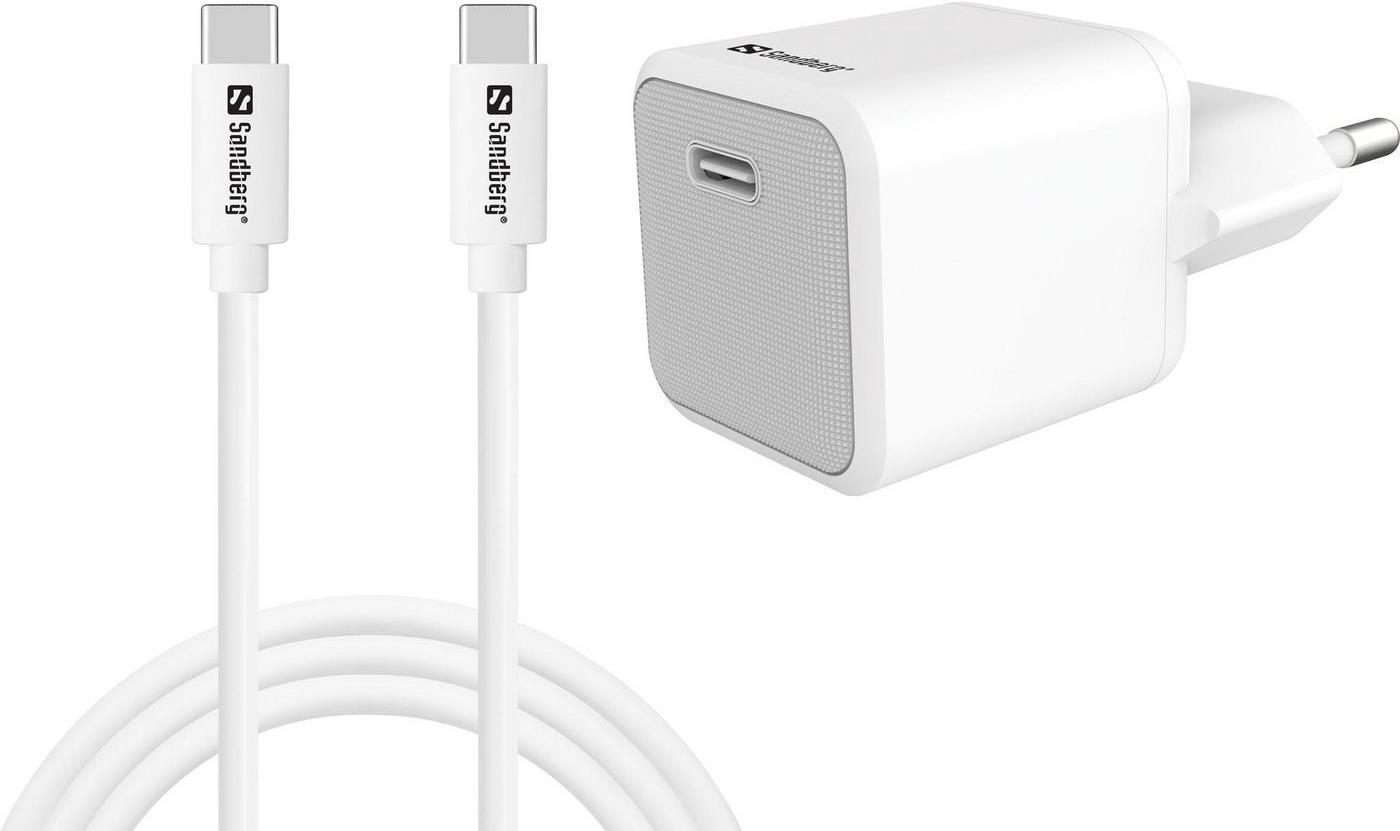 Sandberg - Netzteil - 2-in-1 - 20 Watt - 3 A - PD (24 pin USB-C) - auf Kabel: USB-C - weiß - Europa - mit Kabel USB-C auf USB-C (441-58)
