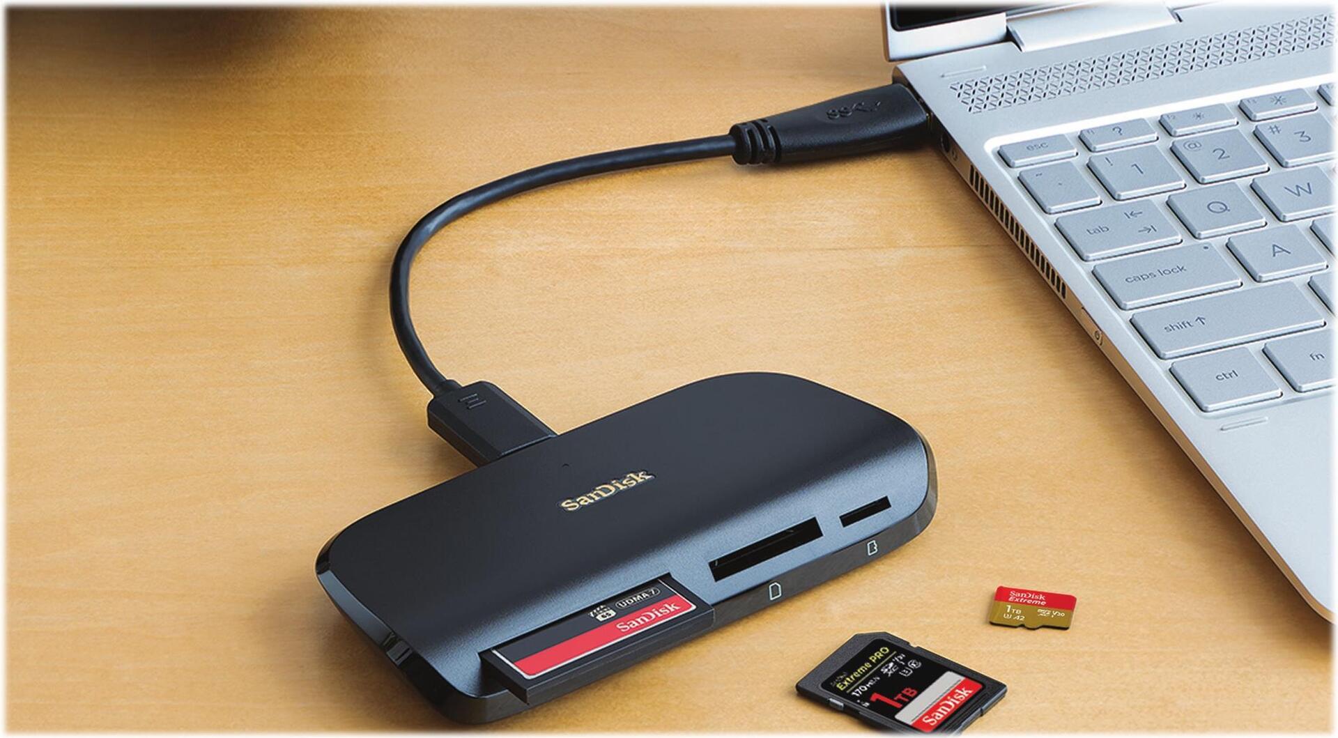 Das SanDisk ImageMate PRO-Kartenlesegerät funktioniert mit SD- und microSD- sowie CompactFlash-Speicherkarten. Es erreicht Übertragungsgeschwindigkeiten von bis zu 312 MB/s bei SD- und microSD-Karten und bis zu 160 MB/s bei CompactFlash-Karten. Die USB-3.0-Schnittstelle verschiebt Daten bis zu 10-mal schneller als der Vorgängerstandard USB 2.0.