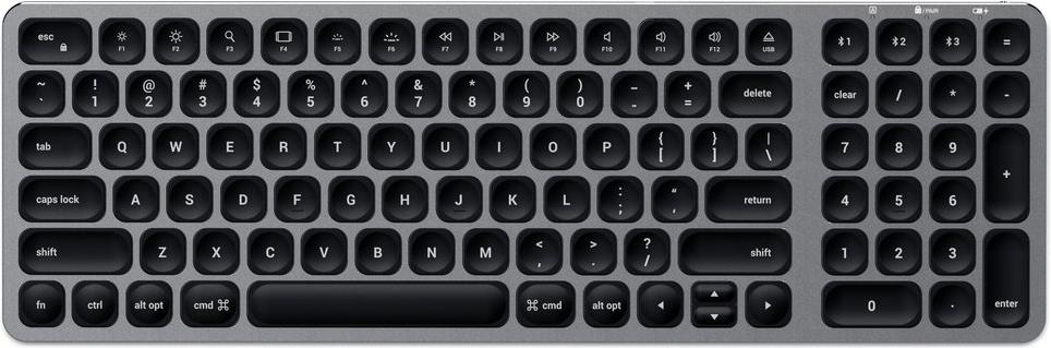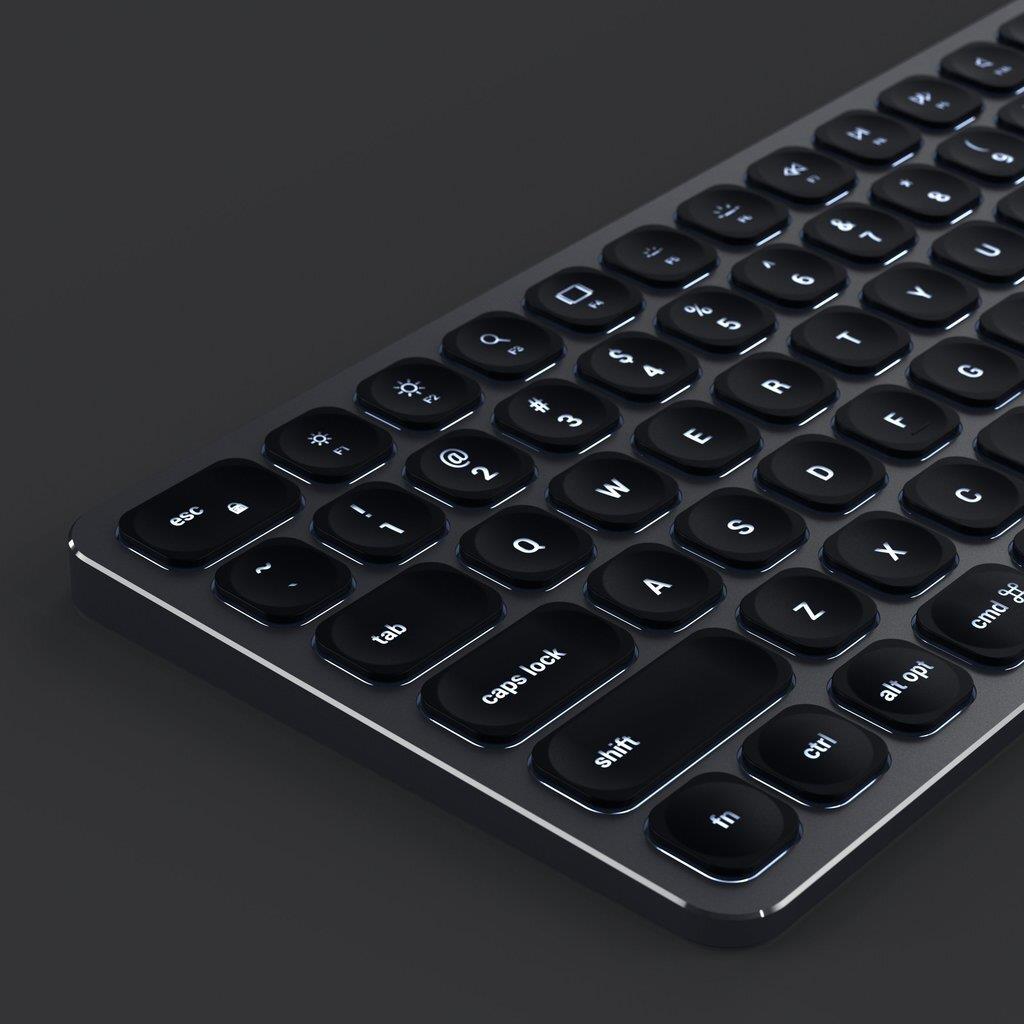 Satechi ST-ACBKM-DE. Tastatur Formfaktor: Standard. Tastatur-Stil: Gerade. Geräteschnittstelle: Bluetooth, Tastatur-Schlüsselschalter: Halbmechanischer Schlüsselschalter, Tastaturaufbau: QWERTZ. Typ der Hintergrundbeleuchtung: LED. Empfohlene Nutzung: Haus. Produktfarbe: Schwarz, Grau (ST-ACBKM-DE)