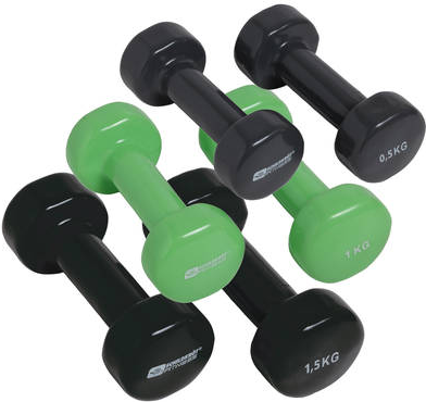 Hantelset bestehend aus 2 Hanteln á 0,5kg anthrazit, 2 Hanteln á 1,0kg grün und 2 Hanteln á 1,5kg schwarz, Gußeisenkern mit strapazierfähiger und griffiger Vinyl-Ummantelung (dadurch unempfindlich gegen Schweiß und ...