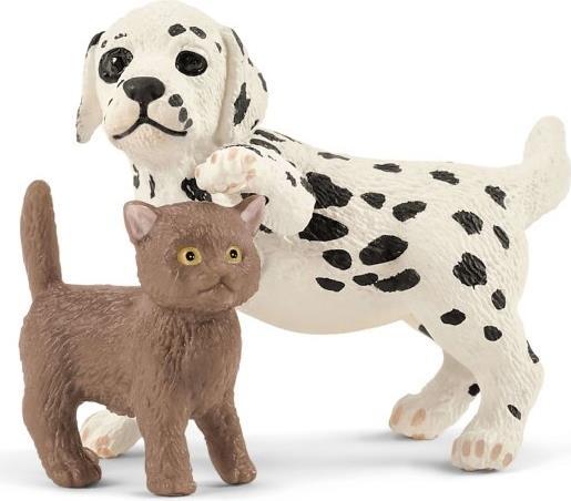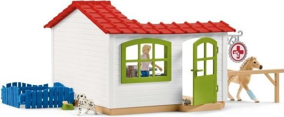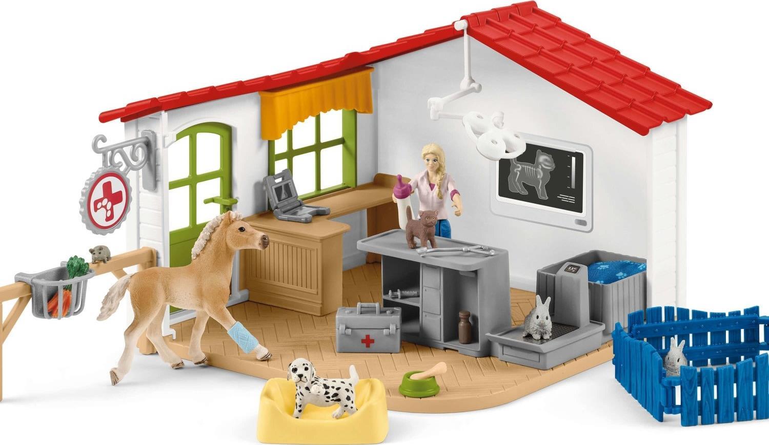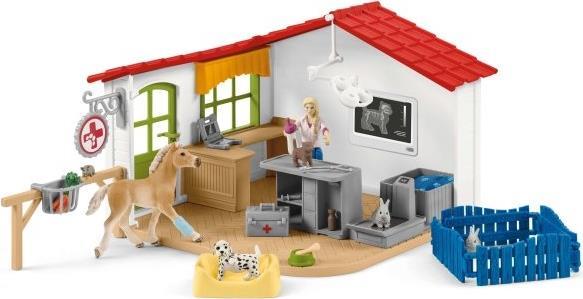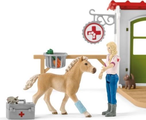 1x vet practice, 1x vet, 1x Haflinger foal, 1x Dalmatian puppy, 1x kitten, 2x rabbit, 1x mouse, 1x dog basket, 1x blanket, 1x bowl, 1x drinking bottle, 1x feeding rack, 1x bone, 1x carrot, 1x laptop, 1x vet's case, 1x medicine bottle, 1x stethoscope, 1x syringe, 2x bandage, 4x fence, 1x sticker sheet |