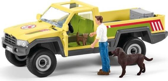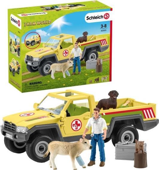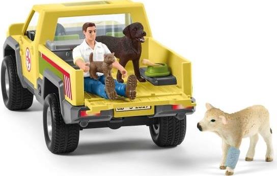 1x pick-up, 1x vet, 1x calf, 1x Labrador Retriever, 1x kitten, 1x aluminium box, 1x stethoscope, 1x bandage, 1x bowl, 1x bone, 1x tree trunk, 1x sticker sheet |