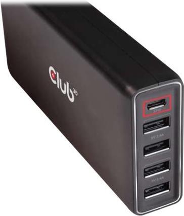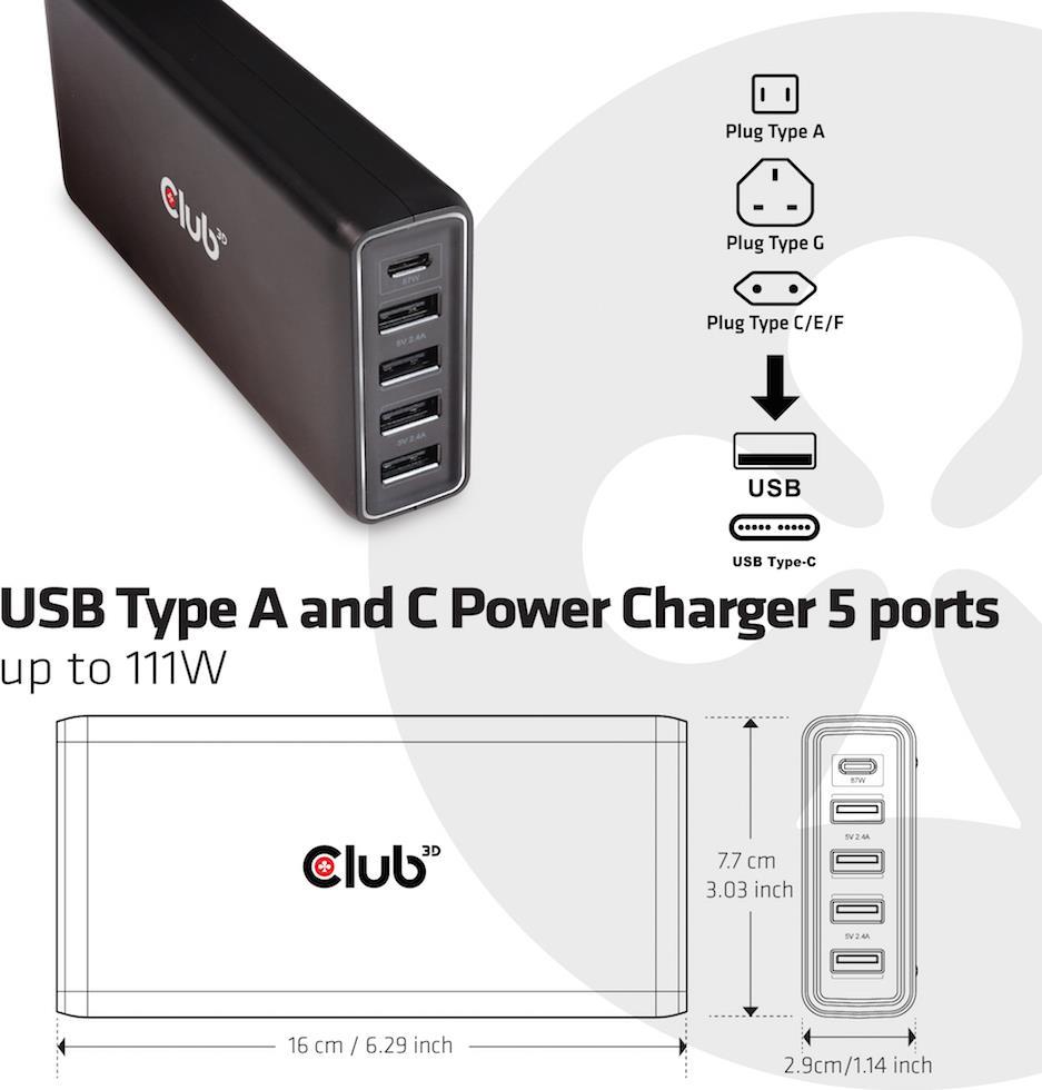 CAC-1903 - Das Club3D USB Typ A und C Ladegerät 5 Ports für bis zu 111W, mit 4x USB Typ A und 1x USB Typ C Buchse wurde entwickelt für Nutzer, die nur 1 Ladegerät für Ihre(n) PC/Laptop/Tablet/Smartphone, aber auch Ihre Docking Station nutzen wollen. Es wird mit einem separaten Stromkabel geliefert, damit es an eine Wandsteckdose angeschlossen werden kann.