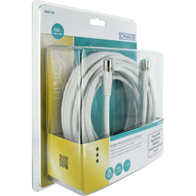 Dieses Schwaiger Modem Anschlusskabel für Self-Install ist für höhere Anforderungen bei hochauflösenden Bild- und Tonübertragungen konzipiert. Es eignet sich zum Anschluss eines Kabelmodems an eine Multimediadose sowie auch als Anschlusskabel für SET Top Boxen mit F-Anschluss. Das Kabel bietet durch das sehr hohe Schirmmaß (Klasse A + 10dB) höchstmöglichen Schutz vor elektromagnetischen Störeinflüssen und Funkstörungen aller Art.Hauptmerkmale