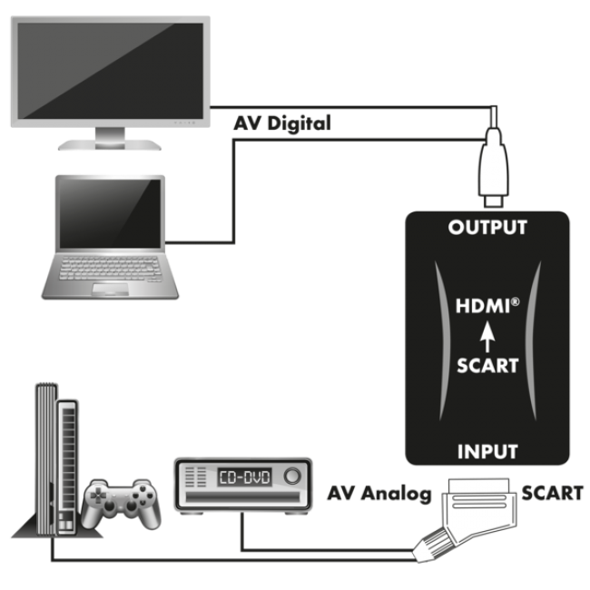 Dieser SCHWAIGER SCART-auf-HDMI-Konverter dient zur Umwandlung einer analogen Bild- und Tonübertragung in ein digitales Signal. So können Wiedergabegeräte, die nur eine SCART-Schnittstelle haben, wie z.B. DVD-Player, Set-Top-Boxen oder Spielekonsolen, an ein HD-Anzeigegerät angeschlossen werden. Der Konverter ist universell einsetzbar und verfügt über einen SCART-Eingang sowie einen digitalen HDMI-Ausgang.