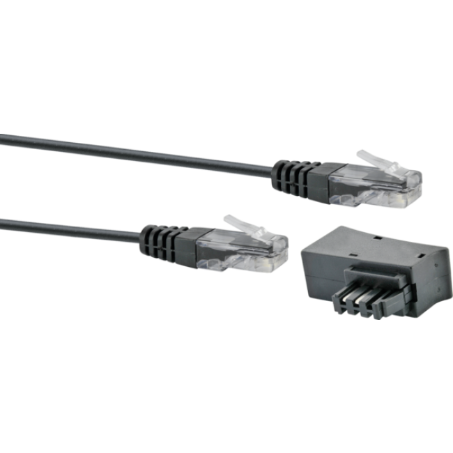 Dieser SCHWAIGER Steckeradapter mit Modemkabel wird u.a. für den DSL-Anschluss von Telekom Speedport- oder Fritzbox-Modellen an der Telefondose eingesetzt.