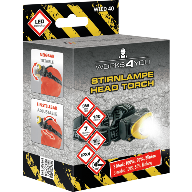 Schwaiger WLED 40. Taschenlampen-Typ: Stirnband-Taschenlampe, Produktfarbe: Schwarz, Gelb, Steuerung: Tasten. Lampentyp: COB LED, Anzahl Lampe(n): 1 Lampen, Lampenleistung: 3 W. Akku-/Batterietyp: AAA, Batteriespannung: 1,5 V, Akku-/Batteriebetriebsdauer: 7 h. Menge pro Packung: 1 Stück(e), Verpackungsart: Box. Anzahl enthaltener Batterien: 1 Stück(e) (WLED40531)