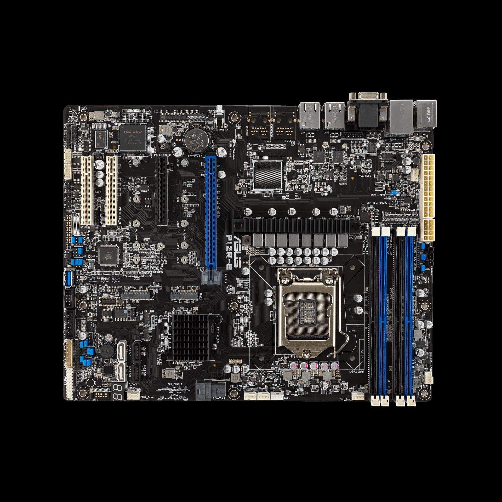 Das Server-Mainboard P12R-E im ATX-Formfaktor ist vollständig für thermische Effizienz optimiert und bietet eine Vielzahl von Optionen, einschließlich Kompatibilität mit unterschiedlichen SSDs und Festplatten sowie USB 3.2-Konnektivität.