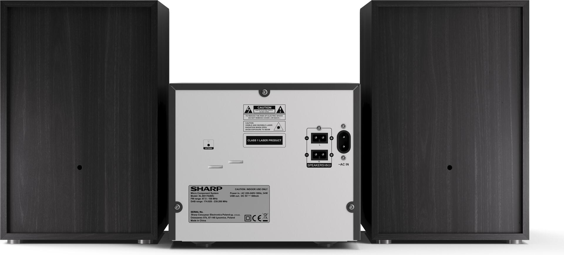 Sharp XL-B517D. Typ: Heim-Audio-Mikrosystem, Produktfarbe: Schwarz, Anzahl an optischen Scheiben: 1 Disks. RMS-Leistung: 45 W, Lautsprechertyp: Voller Bereich, Frequenzbereich: 60 - 20000 Hz. Unterstützte Bänder: DAB+,FM, Verbesserung des Tuners: Automatischer Suchlauf. Display-Typ: LCD. Energiequelle: AC (XL-B517DBK)