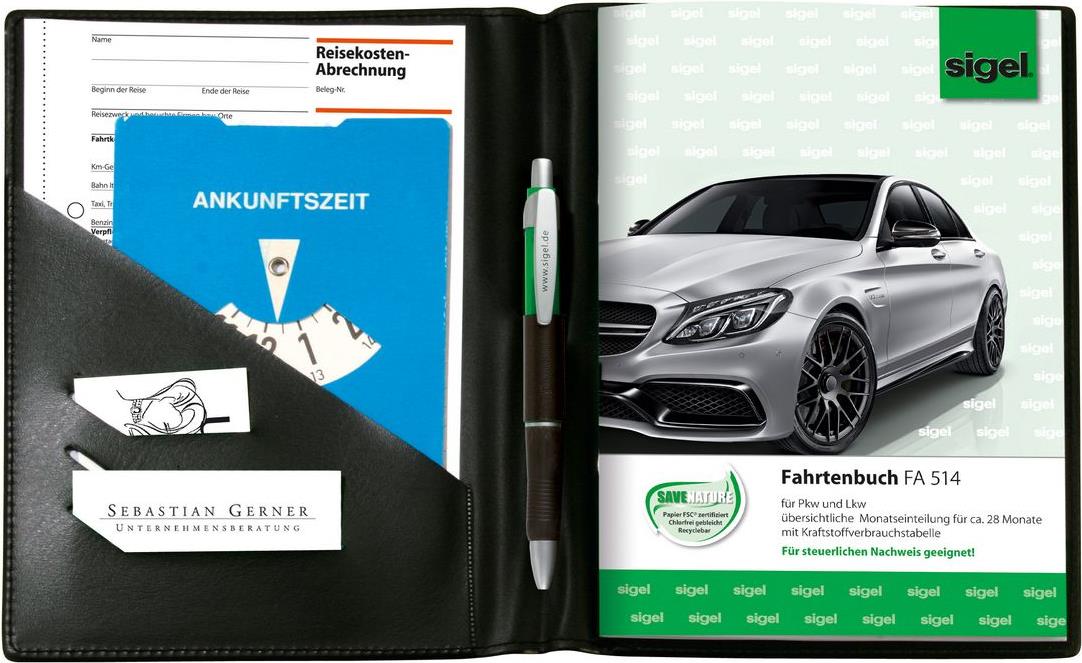 Einband zur sicheren und sauberen Aufbewahrung von Fahrtenbüchern und anderen Formularbüchern im Format DIN A5. In ansprechender Lederoptik, mit praktischen Einstecktaschen für Belege oder Notizzettel und integriertem Stifthalter. Verwendbar z.B. zum Einstecken eines DIN A5-Fahrtenbuches, einer Rechnung, eines Lieferscheins oder als Schreibunterlage auf unebenen Flächen.