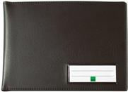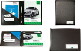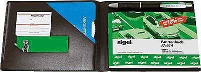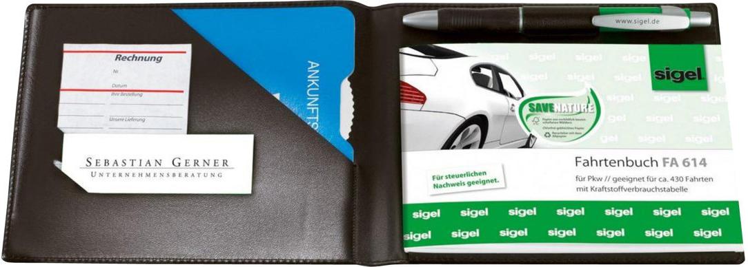 Einband zur sicheren und sauberen Aufbewahrung von Fahrtenbüchern und anderen Formularbüchern im Format DIN A6 quer. In ansprechender Lederoptik, mit praktischen Einstecktaschen für Belege oder Notizzettel und integriertem Stifthalter. Verwendbar z. B. zum Einstecken eines Fahrtenbuches, einer Quittung und als Schreibunterlage auf unebenen Flächen.