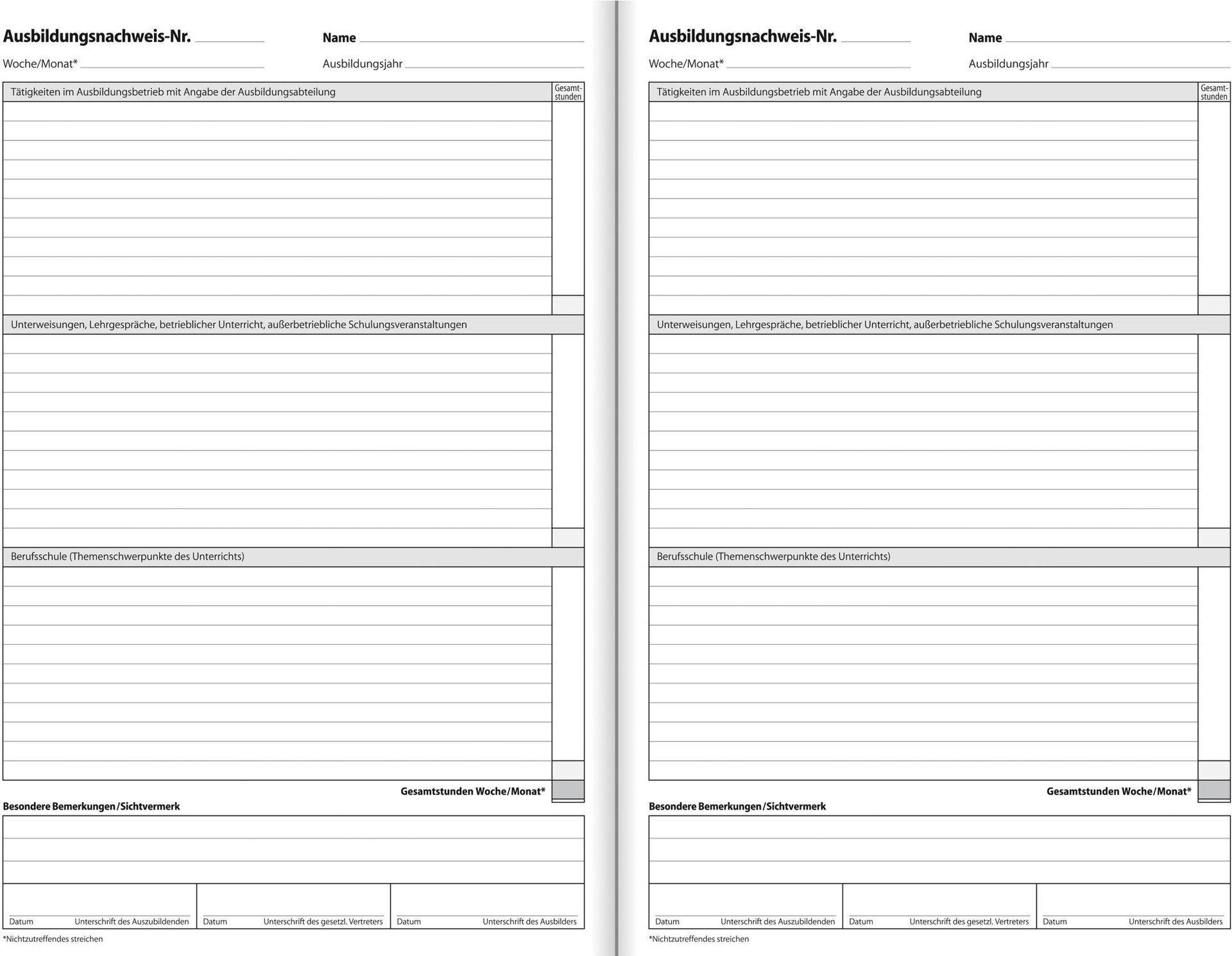 Ausbildungsnachweis (Berichtsheft) für wahlweise wöchentliche oder monatliche Eintragungen im Format DIN A4 mit 28 Blatt. Angabe der Gesamtstundenzahl mit Aufteilung in die 3 Bereiche "Tätigkeiten im Ausbildungsbetrieb", "Unterweisungen/Lehrgespräche, "Berufsschulunterricht". Immer 1 Woche bzw. 1 Monat im Überblick auf 1 Seite, ausreichend für 1 oder 3 Jahr(e). V.a. für kaufmännische Berufe geeignet.