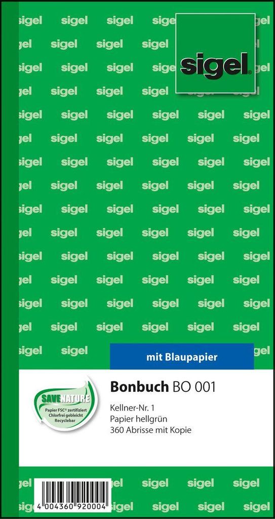 sigel Formularbuch "Bonbuch", Kellner-Nr. 1, hellgrün 105 x 200 mm, 360 Abrisse, mit Blaupapier, 2 x 60 Blatt (BO001)