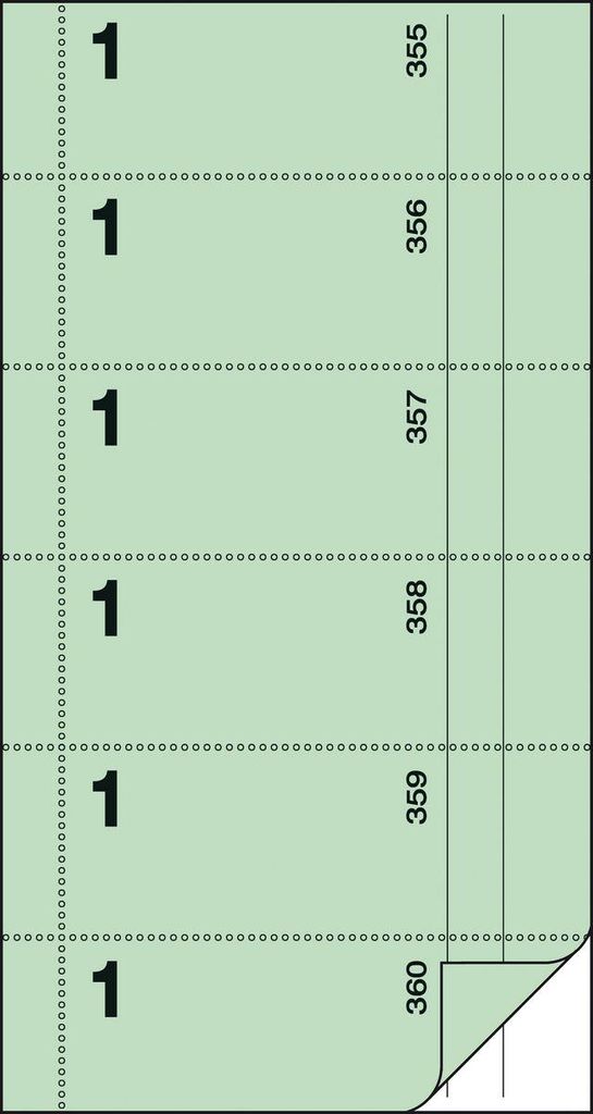 Bonbuch mit 360 Abrissen, Farbe hellgrün, mit eingedruckter Kellnernummer "1". Dank der hervorragenden Schnitt-Steg-Perforation lassen sich die Abrisse ganz einfach, schnell und sauber abtrennen. Besonders stabile und ...