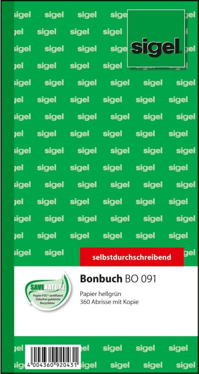 sigel Formularbuch "Bonbuch", 105 x 200 mm, SD, grün 360 Abrisse, selbstdurchschreibend, 2 x 60 Blatt (BO091)