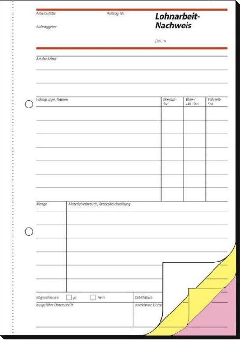 Selbstdurchschreibendes Formularbuch zum genauen Nachweis der Lohnarbeit. Format DIN A5 mit 40 Originalen + 40 x 2 Kopien, inklusive integrierter Schreibunterlage. FSC® zertifiziert, aktuell und rechtssicher. Die erste Kopie ist gelb, die Zweite rosa, alle Blätter mit Abheftlochung und ultrafeiner Microperforation für ein schnelles und sauberes Heraustrennen. Das Formular ermöglicht verschiedene Angaben, z.B. zur Art der Arbeit und der geleisteten Stunden, mit Unterschriftsfeld für den Auftraggeber. Eine Sicherheitsbindung macht das Formularbuch besonders stabil und haltbar.