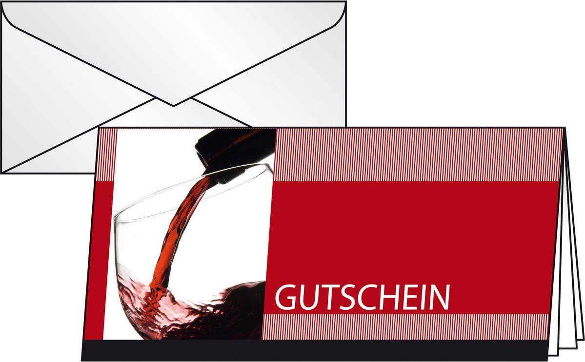 Grammatur: 220 g/m² Format geschlossen: DIN lang (105x210 mm) Format offen: 2/3 DIN A4 Material: Glanzkarton inklusive Einlageblatt mit Innentext Druckereignung: Ink/Laser/Copy 10 Karten hochglänzende Außenseite matte InnenseiteGutschein-Karten \"Vino Rosso\" mit einem Weinglas, das gerade befüllt wird und bordeauxroten Designelementen als Motiv. Die Karten sind individuell einsetzbar und haben einen bereits vorgedruckten Innentext zum schnelleren Ausfüllen Die Gutscheine sind zum Bedrucken mit InkJet- und Laser-Drucker sowie zum Kopieren geeignet und haben eine Grammatur von 220g/m². Im Lieferumfang sind 10 Stück im Format DIN lang enthalten, inklusive passener transparenter Umschläge.