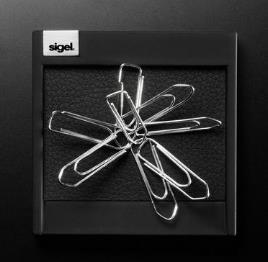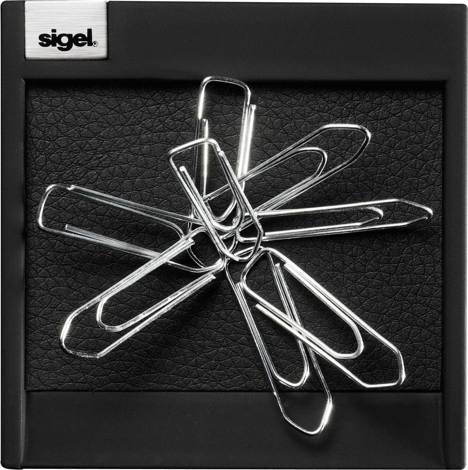 Schwarzer Klammernhalter aus hochwertigem, feingeprägtem Lederimitat und haptisch erfahrbarem, mit Soft-Touch beschichtetem ABS-Kunststoff in sportivem, zeitlosem Design. Ein integrierter, zentraler Magnet garantiert die sichere Aufbewahrung der Büroklammern, die dank einer ergonomischen Griffmulde leicht entnommen werden können. Die rutschfeste Unterseite sorgt dabei für festen Halt. Besonders möbelschonend aufgrund des hochwertigen Mikrofaserstoffs, der auf der Unterseite angebracht ist. Sigel gewährt 2 Jahre Garantie auf diesen Artikel bei Beachtung der beigelegten Pflege- und Gebrauchshinweise. Im Lieferumfang sind 10 Büroklammern enthalten. Die Größe des Klammernspenders beträgt 7,5 x 1,1 x 7,5 cm (B x H x T).