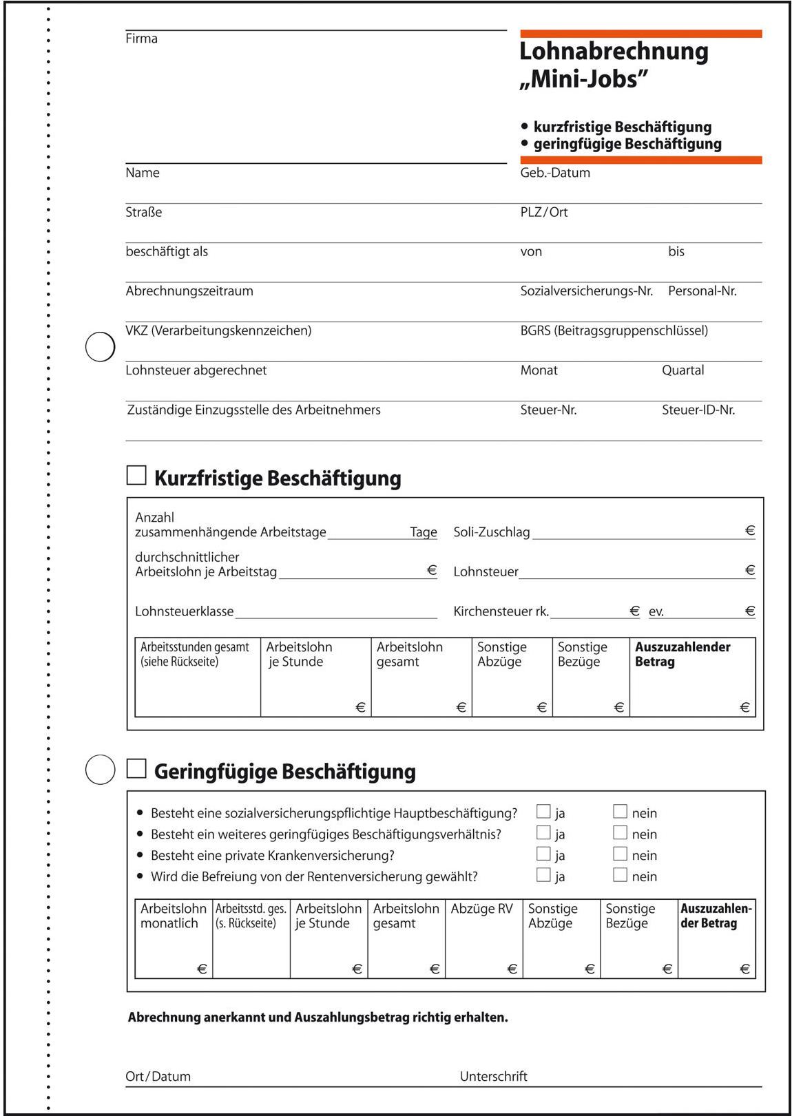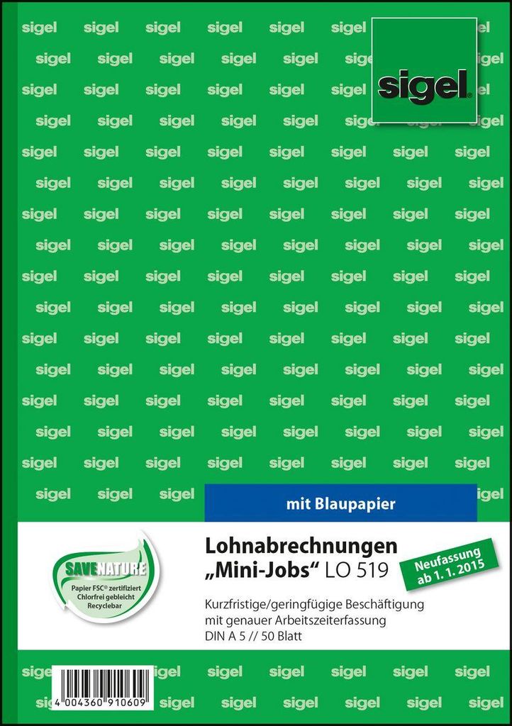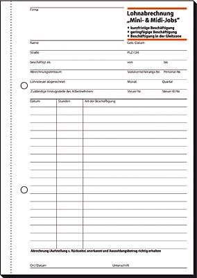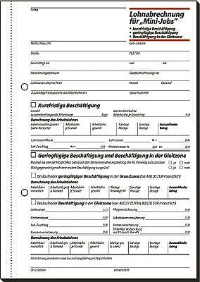 Lohnabrechnung für "Mini-Jobs" - für kurzfristige und geringfügige Beschäftigung im Format DIN A5 mit 50 Blatt, inklusive Blaupapier zum Erstellen eigener Kopien. FSC zertifiziert, aktuell und rechtssicher. Zur genauen Dokumentation der Arbeitszeiten. Anerkannt von den Behörden der Zollverwaltung und vom Finanzamt, mit ausführlichen Hinweisen zum Ausfüllen. Alle Blätter beidseitig bedruckt, mit Abheftlochung und ultrafeiner Microperforation für ein schnelles und sauberes Heraustrennen. Eine Sicherheitsbindung macht das Formularbuch besonders stabil und haltbar.
