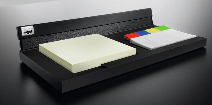 Schwarzes Memocenter aus hochwertigem, feingeprägtem Lederimitat und haptisch erfahrbarem, mit Soft-Touch beschichtetem ABS-Kunststoff in sportivem, zeitlosem Design. Zur praktischen Organisation von Haftnotizen und Haftmarker, welche dank Griffmulden und rutschfester Unterseite ganz einfach entnommen werden können. Besonders möbelschonend aufgrund des hochwertigen Mikrofaserstoffs, der auf der Unterseite angebracht ist. Sigel gewährt 2 Jahre Garantie auf diesen Artikel bei Beachtung der beigelegten Pflege- und Gebrauchshinweise. Im Lieferumfang enthalten sind Sigel Haftmarker und Haftnotizen. Nachfüllbar mit Sigel Haftmarkern (www.sigel.de/pagemarker) oder vielen gängigen Haftmarkern und Haftnotizen im Format 76 x 76 mm. Die Größe des Memocenters beträgt 20 x 3,6 x 10 cm (B x H x T).