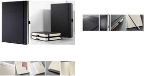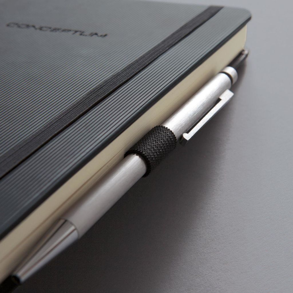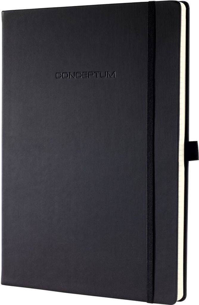 Schwarzes, liniertes Notizbuch CONCEPTUM . Hardcover-Einband mit geriffelter Kunststoff-Oberfläche. Enthält 194 nummerierte Seiten, inklusive 20 perforierter Blätter zum Heraustrennen. Zu den Besonderheiten zählen Stiftschlaufe, Gummibandverschluss, Inhaltsverzeichnis, Quickpocket, Archivtasche mit 2 Kartenfächern für je bis zu 10 Visitenkarten, 2 Zeichenbänder und Titel- und Rückenetiketten. Die Größe des Buches ist größer als DIN A4 - so können DIN A4-Blätter problemlos in das Buch eingelegt werden.