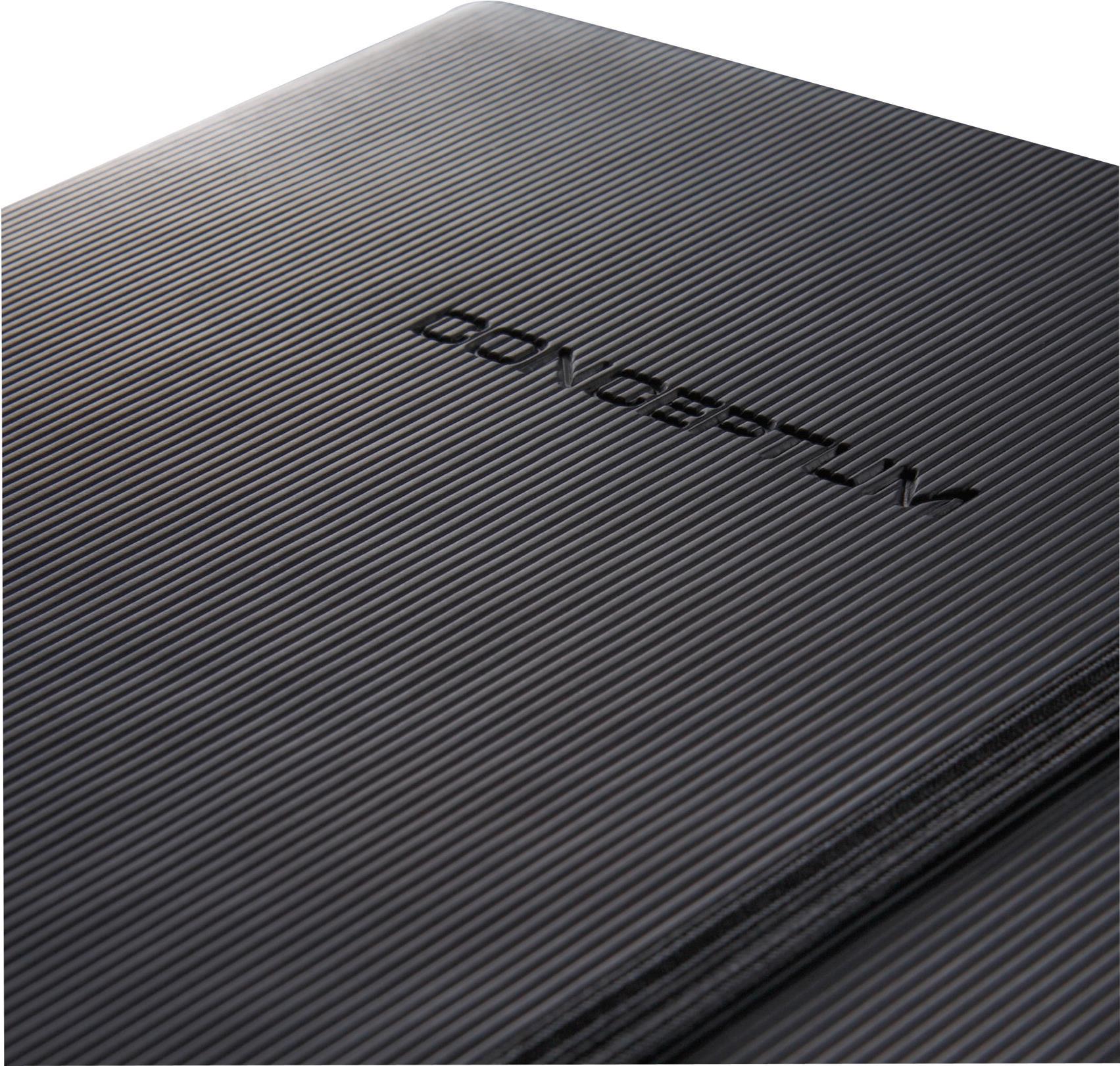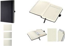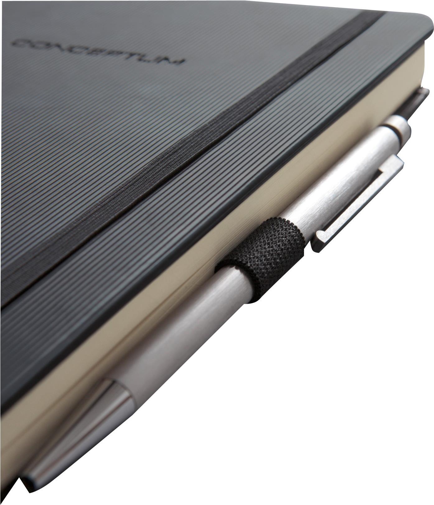 Schwarzes, blanko Notizbuch CONCEPTUM . Hardcover-Einband mit geriffelter Kunststoff-Oberfläche. Enthält 194 nummerierte Seiten, inklusive 20 perforierter Blätter zum Heraustrennen. Zu den Besonderheiten zählen Stiftschlaufe, Gummibandverschluss, Inhaltsverzeichnis, Quickpocket, Archivtasche mit 2 Kartenfächern für je bis zu 10 Visitenkarten, 2 Zeichenbänder, Titel- und Rückenetiketten und Einlegeblatt kariert/liniert. Die Größe des Buches ist ähnlich DIN A4. PEFC zertifiziert.