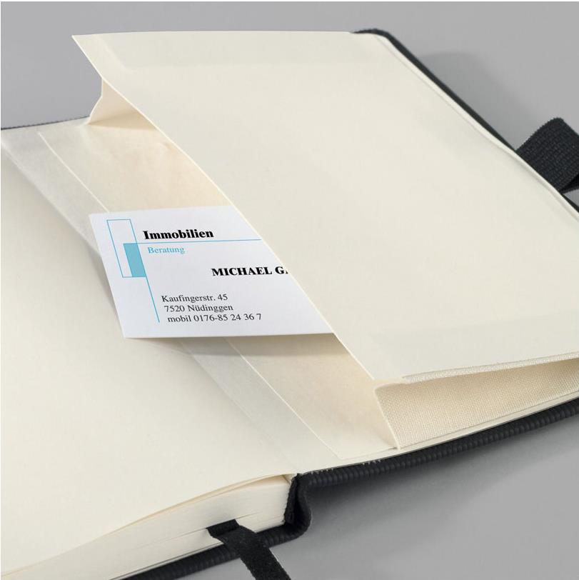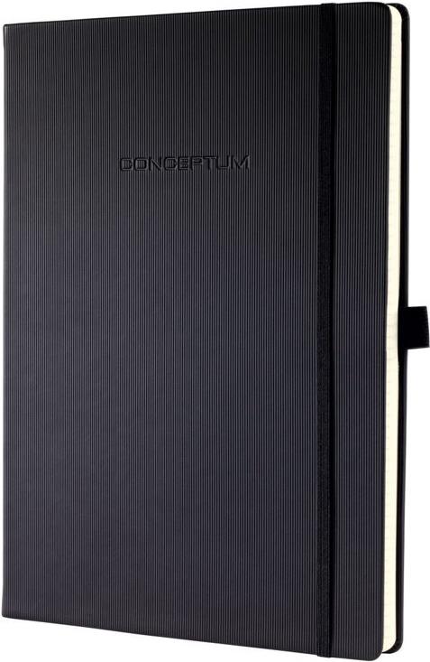 Schwarzes, liniertes Notizbuch CONCEPTUM . Hardcover-Einband mit geriffelter Kunststoff-Oberfläche. Enthält 194 nummerierte Seiten, inklusive 20 perforierter Blätter zum Heraustrennen. Zu den Besonderheiten zählen Stiftschlaufe, Gummibandverschluss, Inhaltsverzeichnis, Quickpocket, Archivtasche mit 2 Kartenfächern für je bis zu 10 Visitenkarten, 2 Zeichenbänder und Titel- und Rückenetiketten. Die Größe des Buches ist ähnlich DIN A4. PEFC zertifiziert.