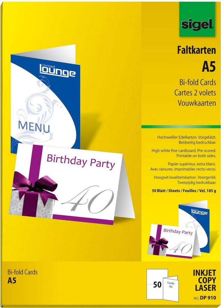 sigel PC-Faltkarten, A5 (A4), 185 g-qm, hochweiß, Edelkarton für Inkjet-Laser-Kopierer, Inhalt: 50 Karten (DP910)