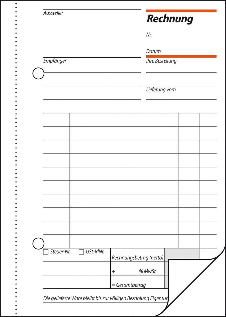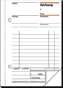 Rechnungsbuch im Format DIN A6 mit 50 Originalen + 50 Kopien, inklusive Blaupapier. FSC zertifiziert, aktuell und rechtssicher, mit allen erforderlichen Angaben wie z.B. IBAN/BIC, Steuernummer/USt-IdNr. und Rechnungsnummer. Original mit Abheftlochung und ultrafeiner Microperforation für ein schnelles und sauberes Heraustrennen. Die Kopie ist undbedruckt und ohne Perforation zum Verbleib im Buch. Eine Sicherheitsbindung macht das Formularbuch besonders stabil und haltbar.