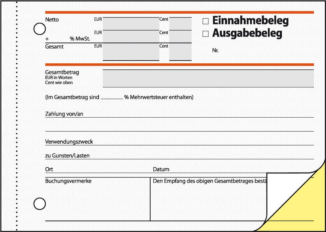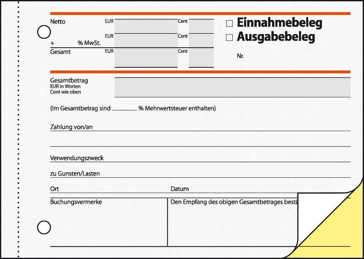 Selbstdurchschreibender Ausgabe-/Einnahmebeleg im Format DIN A6 quer mit 40 Originalen + 40 gelben Kopien, inklusive integrierter Schreibunterlage. FSC zertifiziert, aktuell und rechtssicher. Alle Blätter mit Abheftlochung und ultrafeiner Microperforation für ein schnelles und sauberes Heraustrennen. Mit Empfangsbestätigung, MwSt.-Nachweis und fälschungssicherem Dokumentendruck auf allen Blättern. Den gewünschten Verwendungszweck einfach ankreuzen! Eine Sicherheitsbindung macht das Formularbuch besonders stabil und haltbar.
