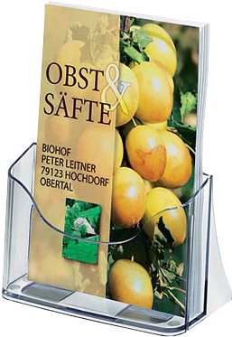 Tisch-Prospekthalter mit einem Fach für Inhalte in der Größe DIN A5. Hochwertiges, glasklares 2,0 mm starkes Acryl vereint die optischen Vorteile von Glas mit der Bruchsicherheit eines Kunststoffes. 25 Jahre Garantie auf die UV-Beständigkeit des Acryls. Der Tisch-Prospekthalter weist eine hohe Stabilität und Standfestigkeit auf. Im Nut- und Federprinzip lassen sich mehrere Tisch-Prospekthalter, auch unterschiedliche Größen, miteinander verketten. Durch die geriffelte Bodeninnenseite und einer gewölbten Rückfläche verrutschen die Inhalte nicht und besitzen eine optimale Standsicherheit. Der Tisch-Prospekthalter bietet Platz bis zu einer Fülltiefe von 30 mm. Die Produktmaße betragen 170 x 200 x 75 mm (B x H x T).