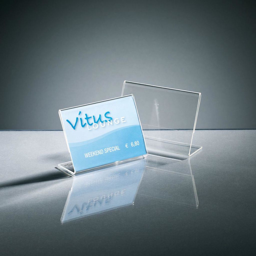 Schräger Tischaufsteller zur einseitigen Präsentation von beispielsweise Aktionen, Hinweisen oder Angeboten in der Größe DIN A7 quer. Für Theken, Tische, Ausstellungsräume und Messen. Hochwertiges, glasklares 1,8 mm starkes Acryl mit polierten, glatten Kanten für hohe Stabilität und Standfestigkeit. 25 Jahre Garantie auf die UV-Beständigkeit des Acryls. Die Außenmaße des Tischaufstellers betragen 105 x 77 x 38 mm (B x H x T).