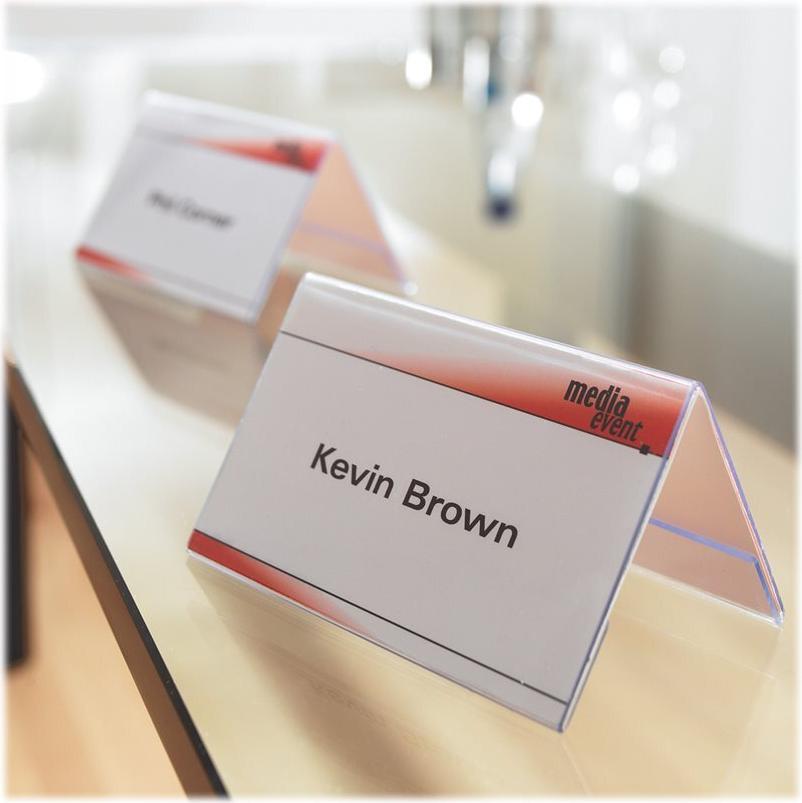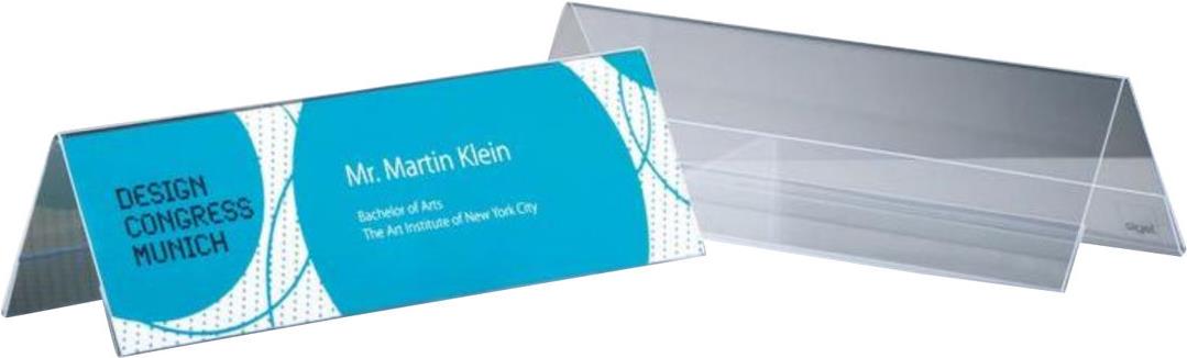 Vielseitig einsetzbarer Tischaufsteller in Dachform, zur beidseitigen Präsentation. Geeignet für Einsteckschilder im Format 190 x 60 mm. Packung inklusive Einsteckschilder. Der Aufsteller besteht aus glasklarem Hartplastik. Passende PC-beschriftbare Einsteckschilder sind ebenfalls im Sigel-Sortiment erhältlich. Die Außenmaße des Tischaufstellers betragen 190 x 60 x 65 mm (B x H x T).