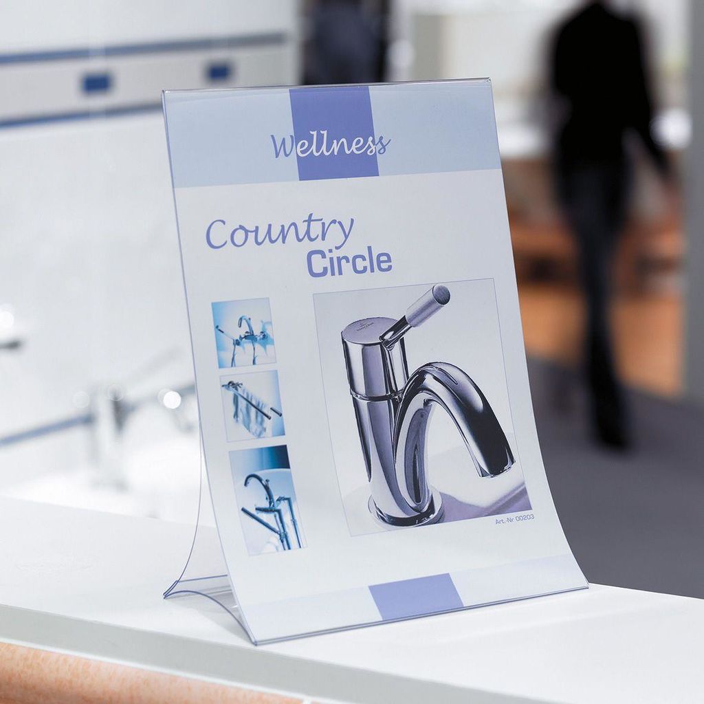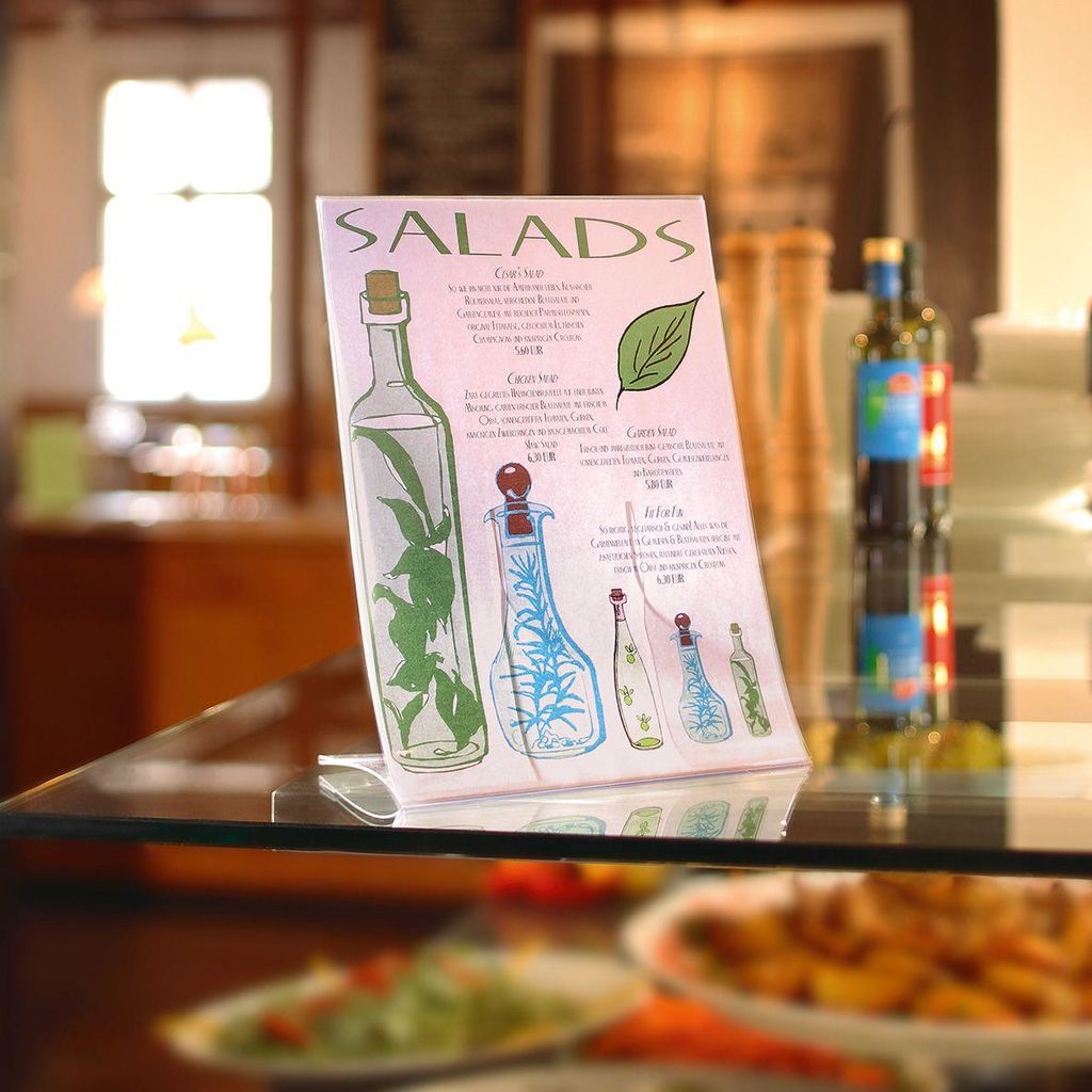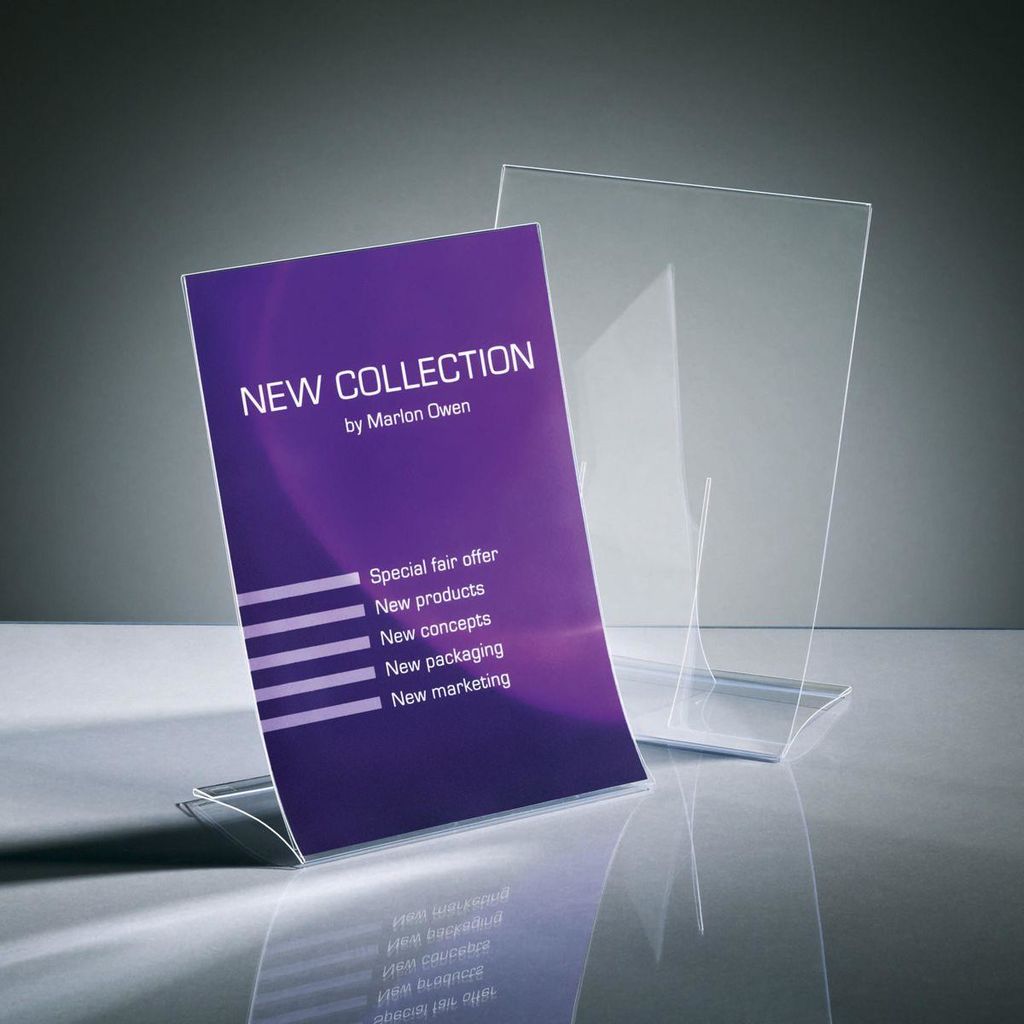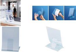 Klappbarer Tischaufsteller zur einseitigen Präsentation von beispielsweise Aktionen, Hinweisen oder Angeboten in der Größe DIN A4. Schnell aufgestellt und absolut standsicher. Zusammengeklappt ist er flach und leicht und somit für unterwegs geeignet. Aus glasklarem und bruchsicherem Hartplastik. Die Außenmaße des Tischaufstellers betragen 210 x 300 x 110 mm (B x H x T).