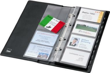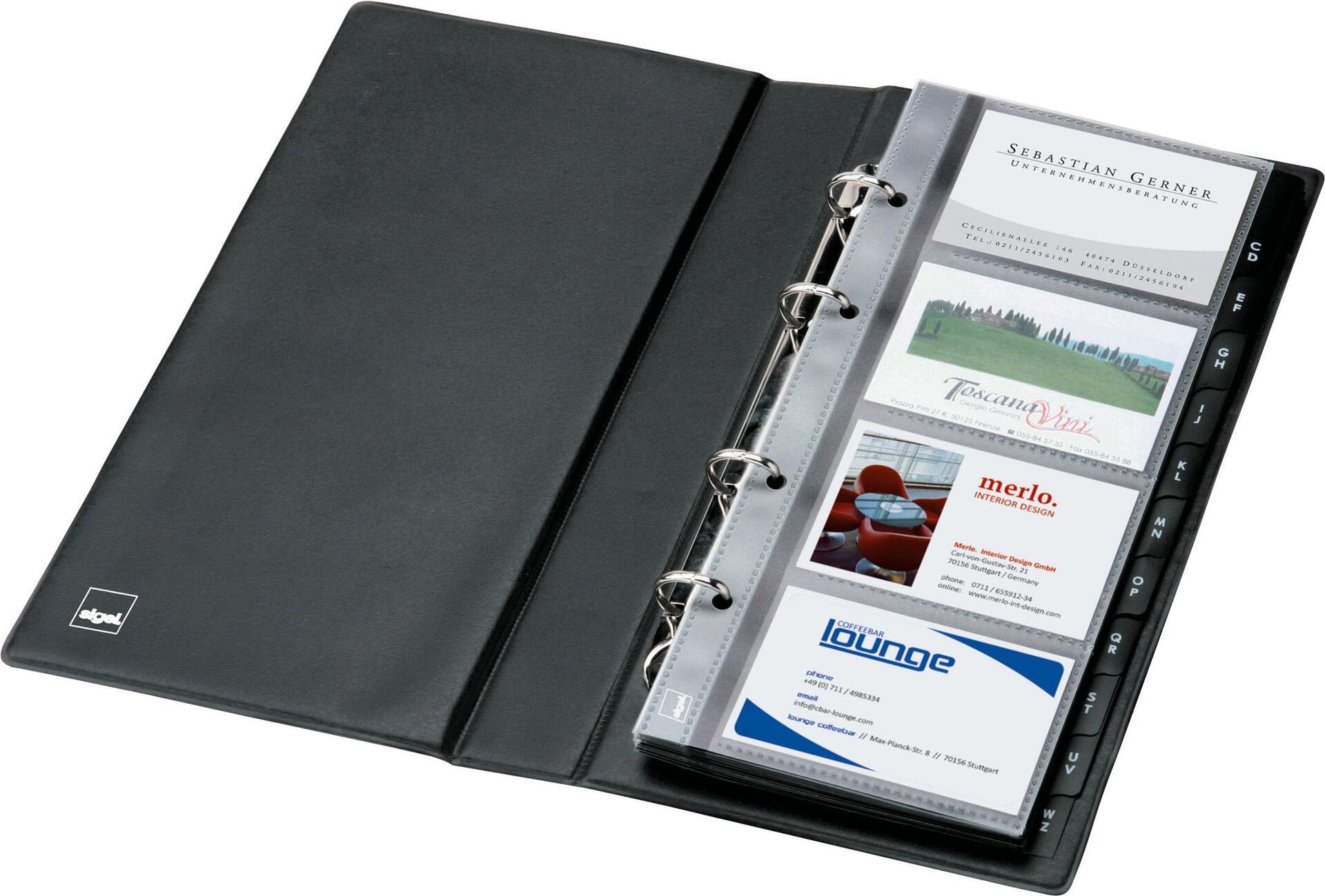 Visitenkarten-Ringbuch aus strapazierfähigem schwarzen Kunststoffeinband mit matt-satinierter Oberfläche und Linienprägung zur platzsparenden und übersichtlichen Organisation von Visitenkarten und anderen Karten. Dank stabiler 4-Ringmechanik und alphabetischem Register ist ein schnelles Einsortieren und Wiederfinden der Karten garantiert. Die 25 mitgelieferten transparenten Hüllen, die sowohl auf der Vorder- als auch Rückseite befüllt werden können, bieten Platz für bis zu 200 Karten (max. 90 x 58 mm). Mit den passenden Sigel Nachkaufhüllen VZ350 (10 Hüllen für bis zu 80 Karten) kann es auf 280 Visitenkarten erweitert werden. Die Größe des Ringbuchs beträgt 147 x 265 x 44 mm (B x H x T).