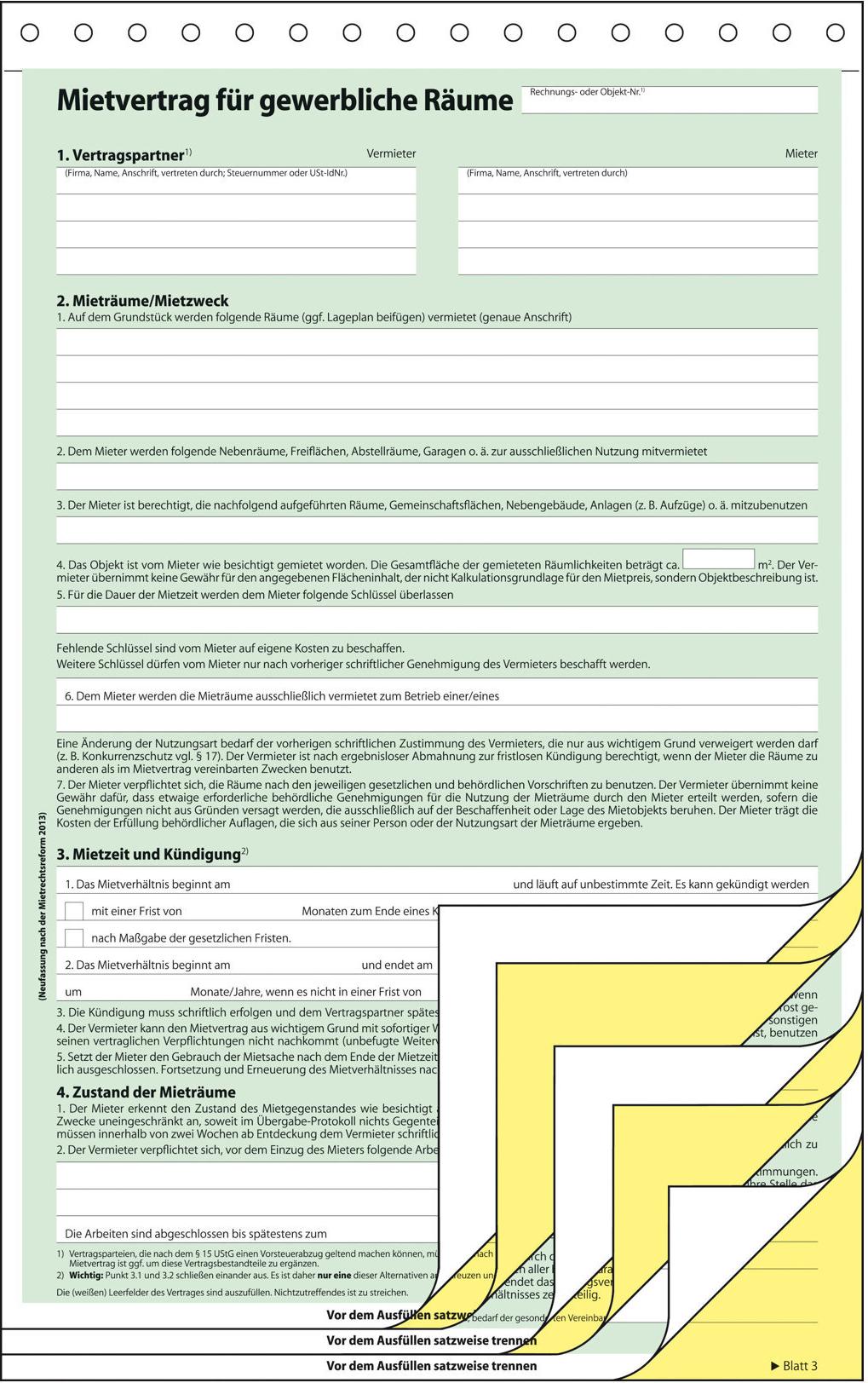 Mietvertrag für gewerbliche Räume. Selbstdurchschreibender Formularsatz im Format DIN A4 mit 3 x 2 Blatt für Mieter und Vermieter. Rechtsicher und aktuell entsprechend den gesetzlichen Bestimmungen des Mietrechts inkl. BGH-Urteile. Geeignet zur Beschriftung mit der Hand oder mit der Schreibmaschine.