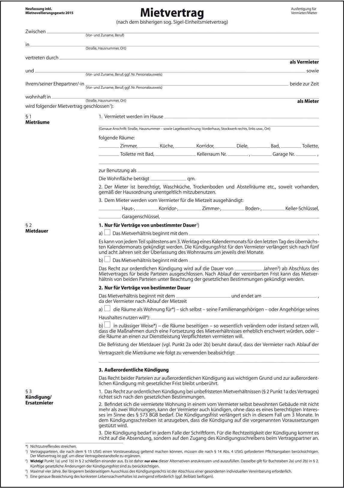 Ausführlicher Mietvertrag (ehemals Einheitsmietvertrag) für die Vermietung von Wohnraum. Mit Hausordnung und detaillierten Angaben zu Miete und Nebenkosten, Format DIN A4, 6seitig. Rechtsicher und aktuell entsprechend den gesetzlichen Bestimmungen des Mietrechts inkl. BGH-Urteile. Geignet zur Beschriftung mit der Hand oder mit der Schreibmaschine.