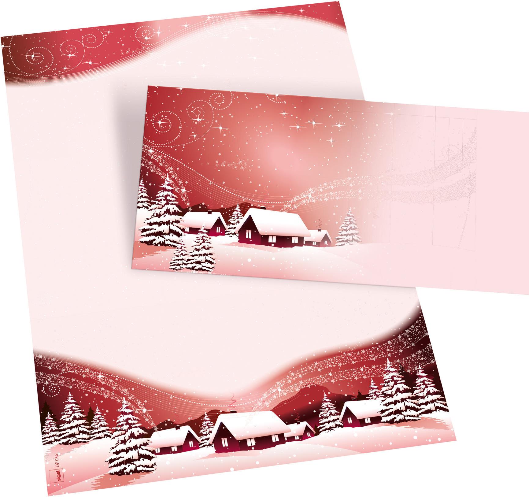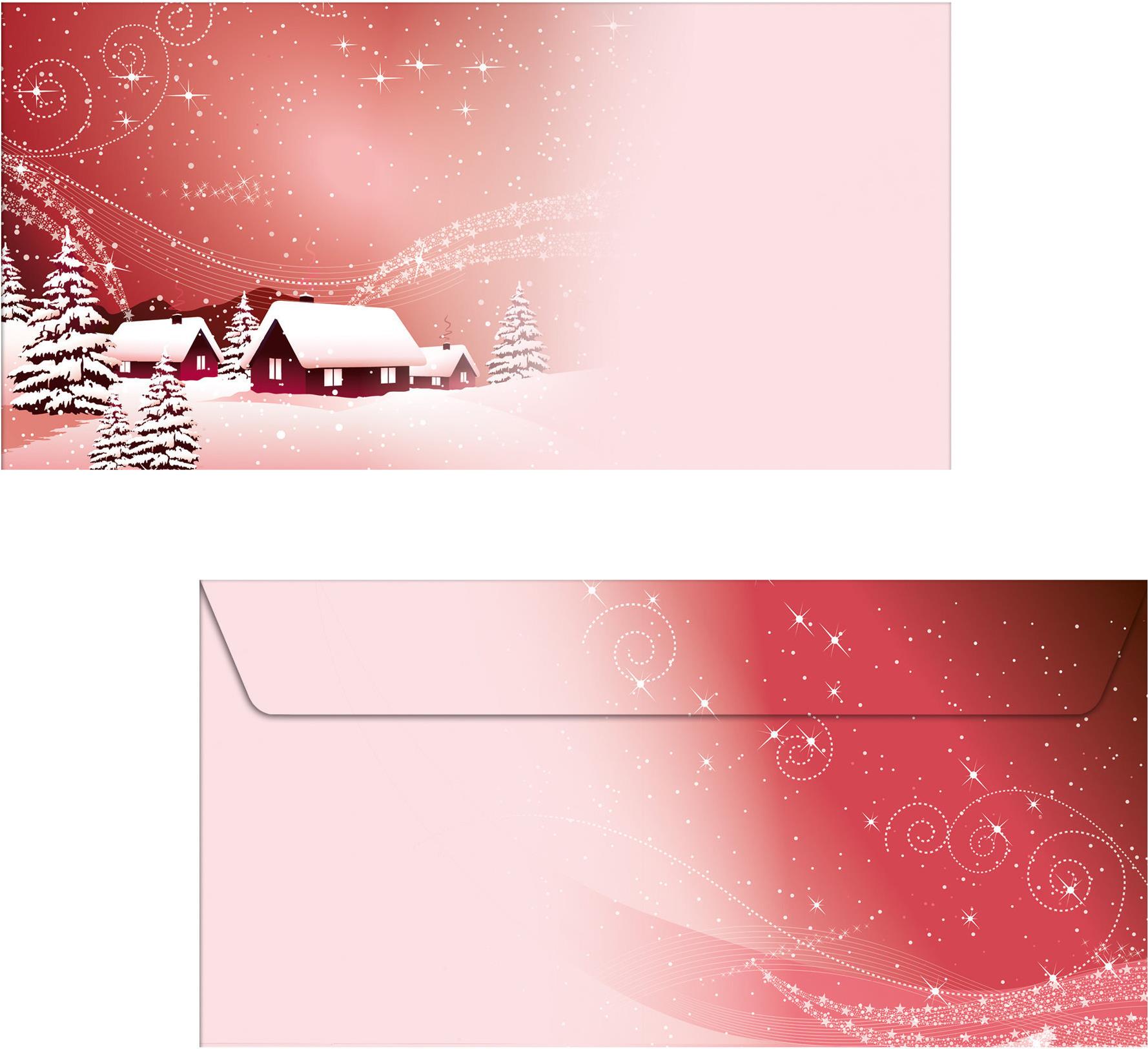 Weihnachts-Umschlag "Silents Night" mit weihnachtlichem Dorf vor rotem Hintergrund als Motiv passend zum Weihnachts-Motiv-Papier DP036. Die gummierten Umschläge ohne Fenster sind für die Beschriftung mit InkJet- und Laser-Drucker sowie Kopierer geeignet. Im Lieferumfang sind 50 Stück im Format DIN lang enthalten.
